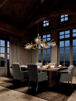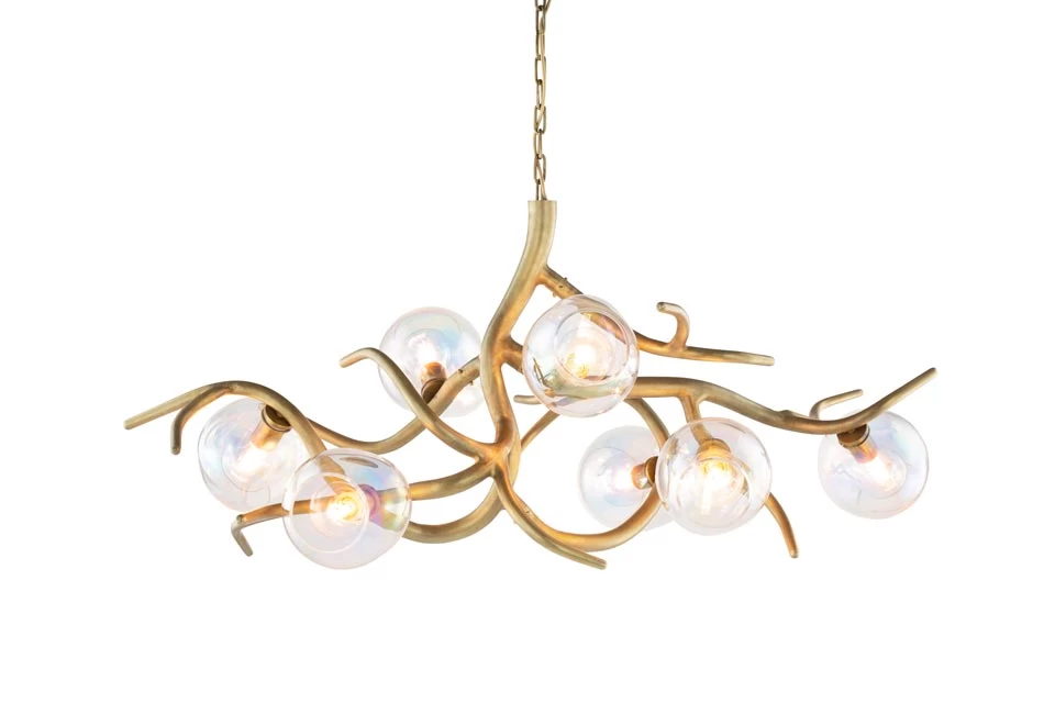Poétique sculpture lumineuse, Ersa est une véritable œuvre d’art qui évoque le branchage chargé de bulles de lumière d’un arbre enchanté. Ce lustre est composée d’une structure fabriquée à la main en forme de branche toute de courbes, avec une superbe finition laiton bruni obtenue grâce à l’oxydation contrôlée du métal, qui donne cette unique patine dorée et intemporelle au modèle. La structure est parsemée de 11 sphères ouvertes de verre iridescent, qui donne une teinte multicolore et magique à la lumière. Le modèle est suspendu sur une chaine métallique discrète. Ersa évoque ce bref moment au lever du soleil qui révèle les délicates gouttes d’eau posées sur la végétation, son nom vient de la déesse grecque de la rosée du matin.