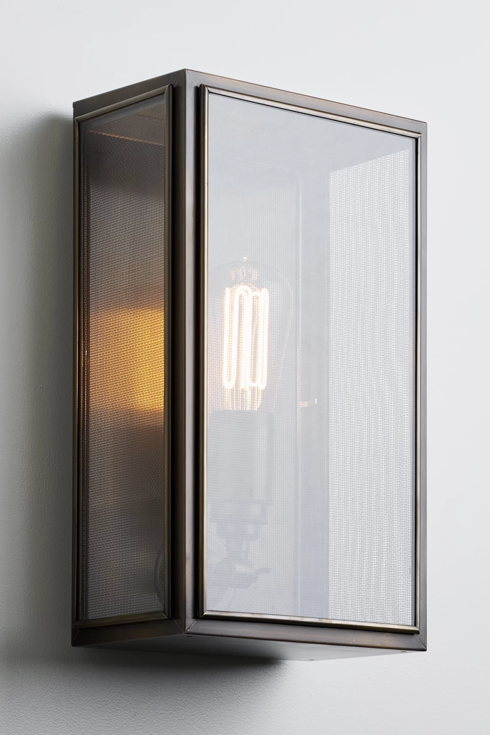 Superbement fabriquées, les appliques de la collection Essex sont constituées d’une cage parallélépipédique fabriquée en bronze. A l’intérieur, l’ampoule est vissée sur une douille en bronze également montée en applique. Les finitions sont exemplaires, les vitres sont serties dans le bronze, l’applique est fermée par un mécanisme traditionnel à ressort et aiguille. Etanches (norme IP44) et fabriquées en matière insensible à la corrosion, ces appliques peuvent être installées à l’extérieur comme à l’intérieur. Avec un surplomb de 12 à 14cm seulement, ces appliques n’encombrent pas le passage, et peuvent être installées dans des couloirs ou escaliers étroits. Le modèle Essex Original est muni d’un paroi interne laquée blanche. Le modèle Essex Mesh est doté d’un fin grillage en bronze diffusant la lumière produite avec efficacité et élégance. Tous les modèles sont munis d’une ampoule décorative Caret Squirrel Cage fournie avec le luminaire. Dimensions: hauteur 36cm, largeur 21,5cm, saillie du mur 14cm
