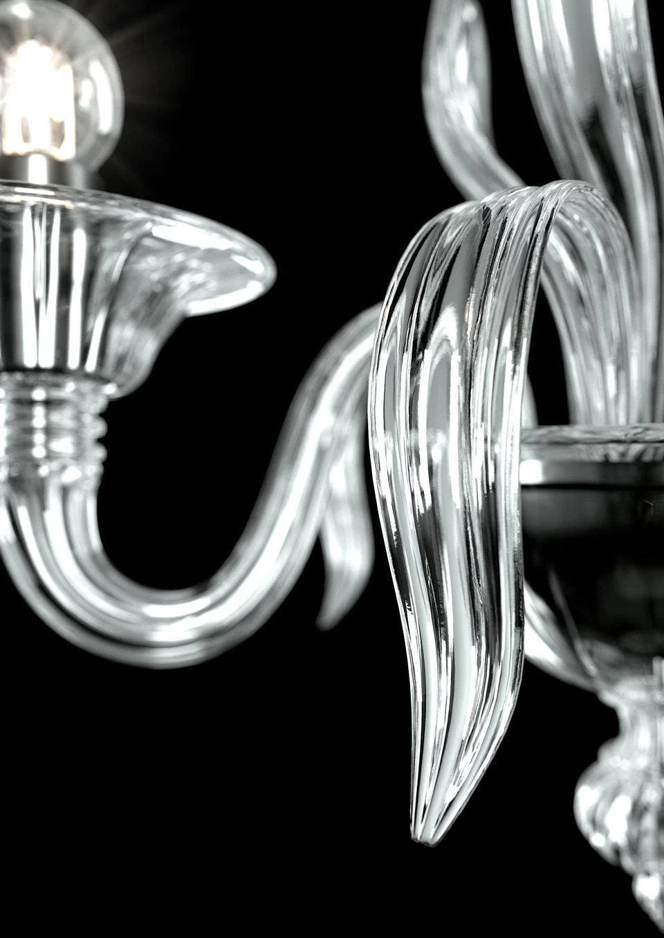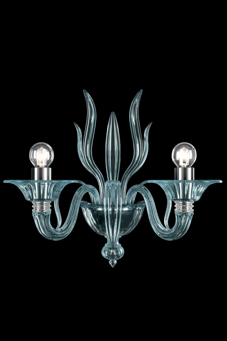 L’applique 2 lumières Fauve est une pièce végétale épurée, sortie des fours des artisans verriers, avec son cristal de Venise bleu aquamarine et ses touches de métal chrome poli. L’applique, entièrement réalisée en cristal bleu aquamarine, est dotée de deux bras en col de cygne qui jaillissent de l’enfilage fixé au mur, ils sont couronnés de bassins en coupelle évasée qui portent les fourreaux des ampoules, en métal finition chrome poli. De fines feuilles élancées émergent également de l’enfilage, qui d’ailleurs est aussi décoré d’une graine qui rappelle l’inspiration de chandelier traditionnel vénitien du modèle. Barovier & Toso, issue d’une longue lignée de maîtres verriers qui remonte au 14ème siècle, perpétue la tradition et les savoir-faire familiaux, tout en ayant introduit une dimension moderniste et une esthétique innovante dans la discipline du travail du verre de Murano.