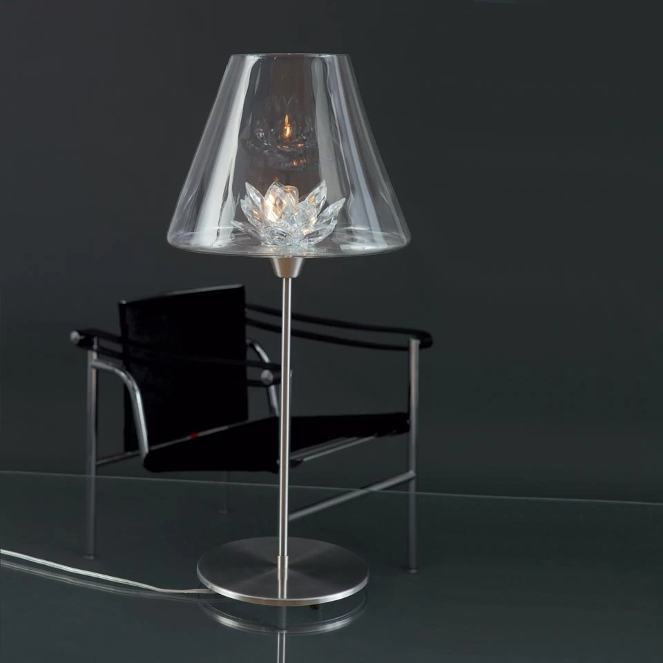 Une jolie lampe de table, le grand modĂšle 68cm de la collection Flower qui marie une touche classique Ă un design contemporain. La lampe est composĂ©e d’un socle et pied droit simple en inox, coiffĂ© d’un abat-jour conique rĂ©alisĂ©e en verre transparent, qui abrite une dĂ©licate fleur en verre transparent minutieusement ciselĂ©e, dont le cĆur est l’ampoule. Les pĂ©tales crĂ©ent un prisme lumineux qui fait varier la lumiĂšre. Chaque modĂšle est fabriquĂ© Ă la main au sein des ateliers Harco Loor et signĂ© par le designer.