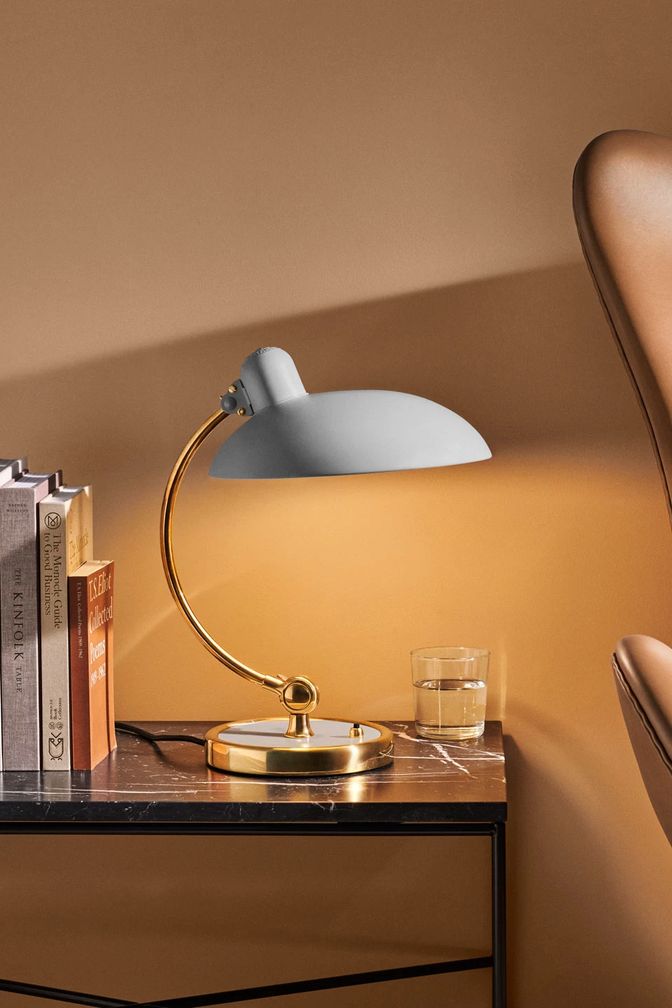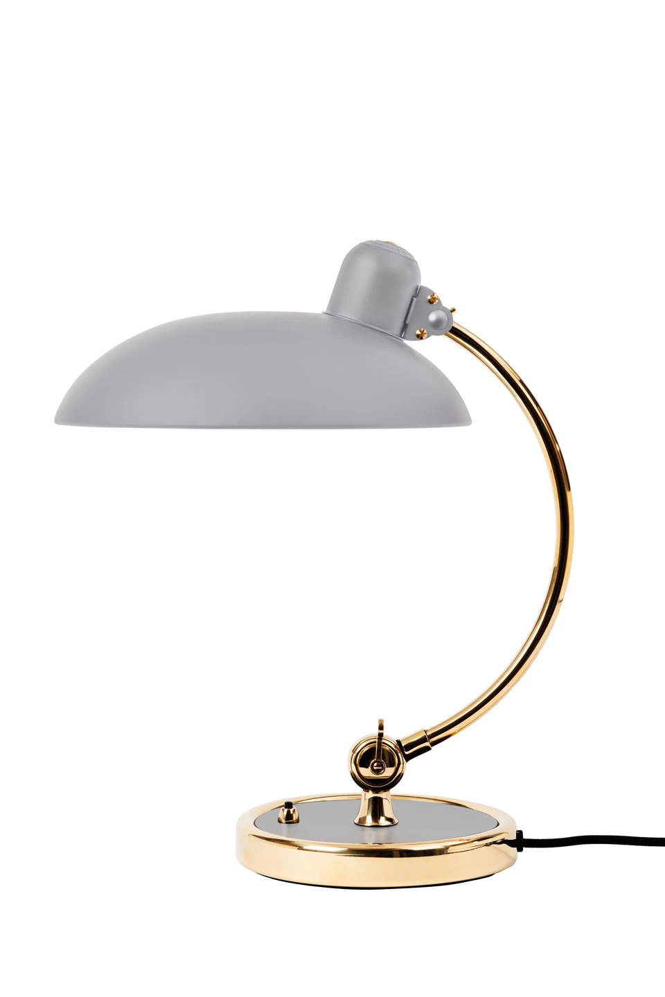 Le charme intemporel d’une esthétique rétro du style Bauhaus habite indéniablement Kaiser Idell lampe de bureau gris clair et or articulée en acier et laiton dotée d’un abat-jour évasé. Le modèle est composé d’un socle rond épais en acier gris brillant cerclé de laiton doré, avec interrupteur en bouton pressoir, surmonté d’un bras en tube doré de laiton fin et courbe monté sur une rotule à vis à manivelle permettant d’adapter la hauteur de la lampe, et enfin d’un large abat-jour tout en rondeur lui aussi monté sur rotule pour permettre de l’orienter en fonction de vos souhaits. L’abat-jour est réalisé en acier avec une élégante finition gris clair mat. Les créations de la maison néerlandaise Fritz Hansen façonnent les intérieurs qu’ils équipent, avec un savoir-faire dans le domaine du meuble affiné depuis 1872 siècle, appliqué dès les années 20 au monde de la lumière avec une série de collections intemporelles et épurées fruit de collaborations avec les plus grands designers.
