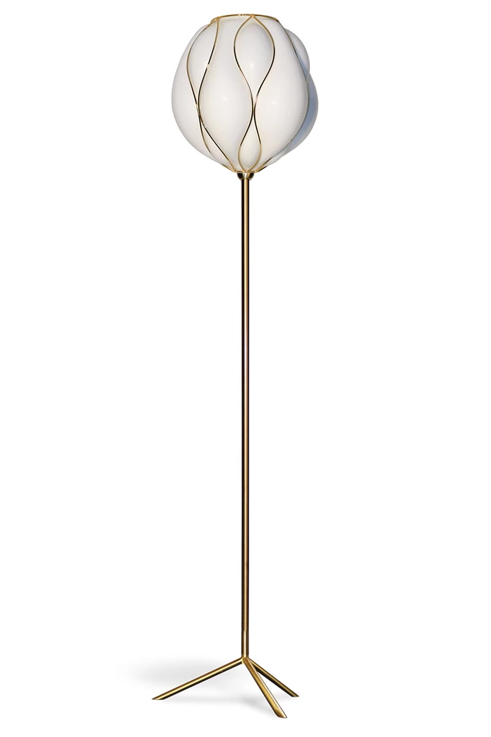 Superbe lampadaire contemporain Gaia de la collection Casamance qui développe une série de lampes d’esprit art déco, ce modèle-ci est un abat-jour en forme de grosse bulle de verre opale irrégulière enchâssée dans une délicate structure de filets de laiton brossé qui forment un cage doré autour de l’abat-jour. Le filet épouse les irrégularités de la sphère, et celle-ci couronne un socle en trépied et un pied également en laiton brossé.