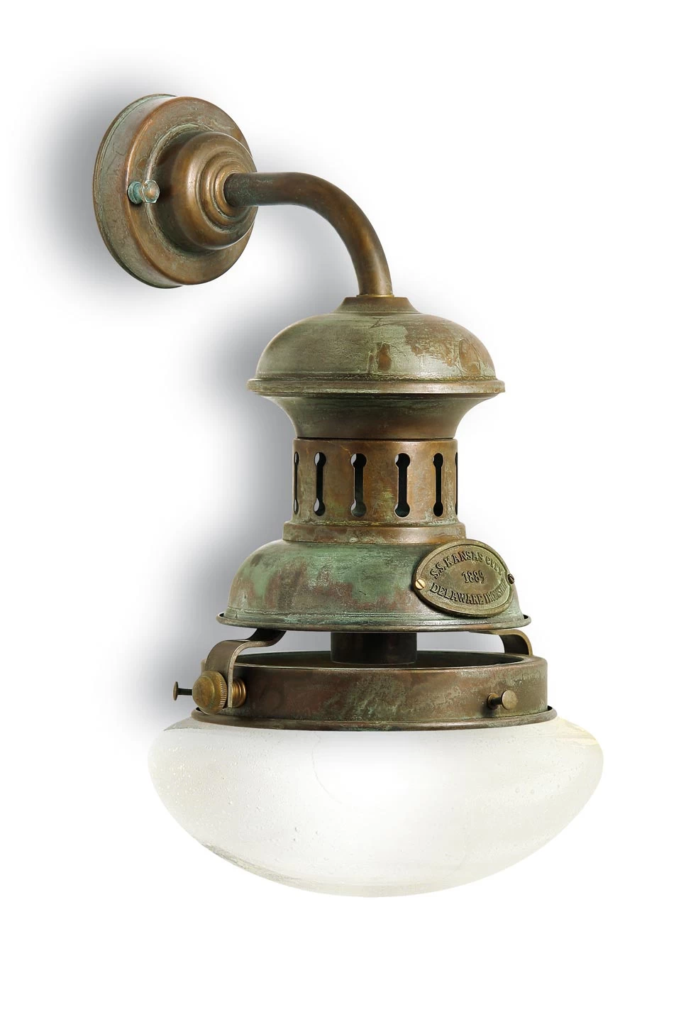 Une jolie applique de la collection Galeone, issue de la gamme Marine. Une grosse bulle de verre bombé transparent est fixée sous une structure d’inspiration lampe à pétrole, avec de petites fentes verticales stylisées sur le cache-douille. Le tout est suspendu à un bras arrondi à 90° et relié à un support mural cylindrique. L’applique est entièrement réalisée en laiton avec une belle finition vieillie, avec ses touches de vert-de-gris. L’utilisation par la maison italienne Moretti d’un laiton massif d’excellente qualité permet la réalisation de luminaires solides et durables.