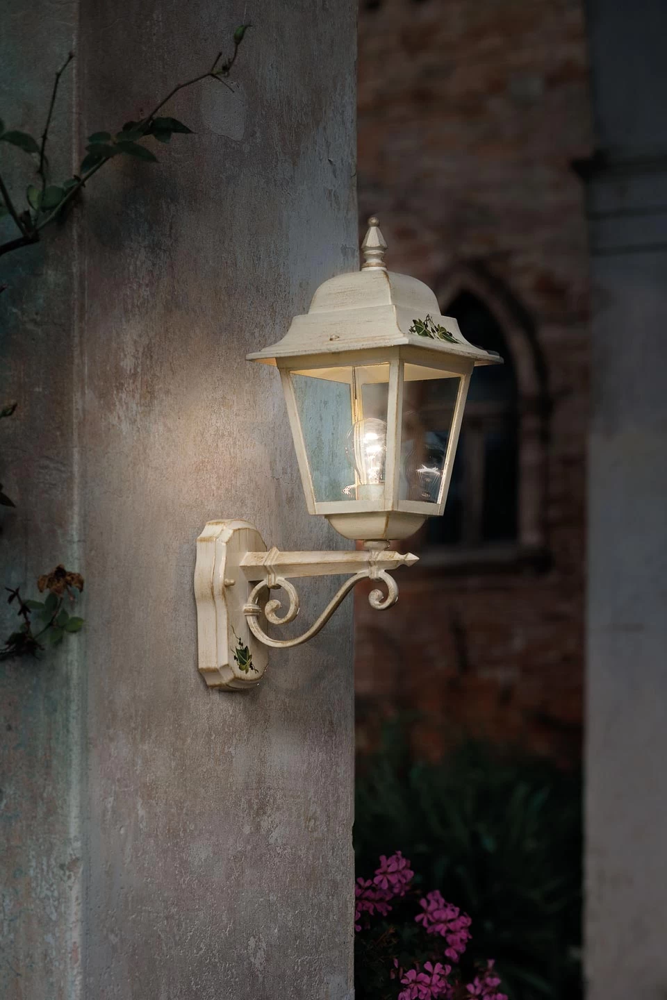Charmante applique déportée d’extérieur de la collection Gorizia, avec son air de lanterne d’un autre temps. Elle est dotée d’une lanterne en métal équipée de 4 faces en verre, qui surmonte sur un bras horizontal décoré d’une spirale et fixé sur un support mural ovale. L’ensemble est ponctué de motifs feuillus verts peints à la main, mis en valeur par la finition blanche patinée du métal, et l’applique est dotée de la protection IP43 qui garantit une bonne résistance aux conditions d’extérieur.