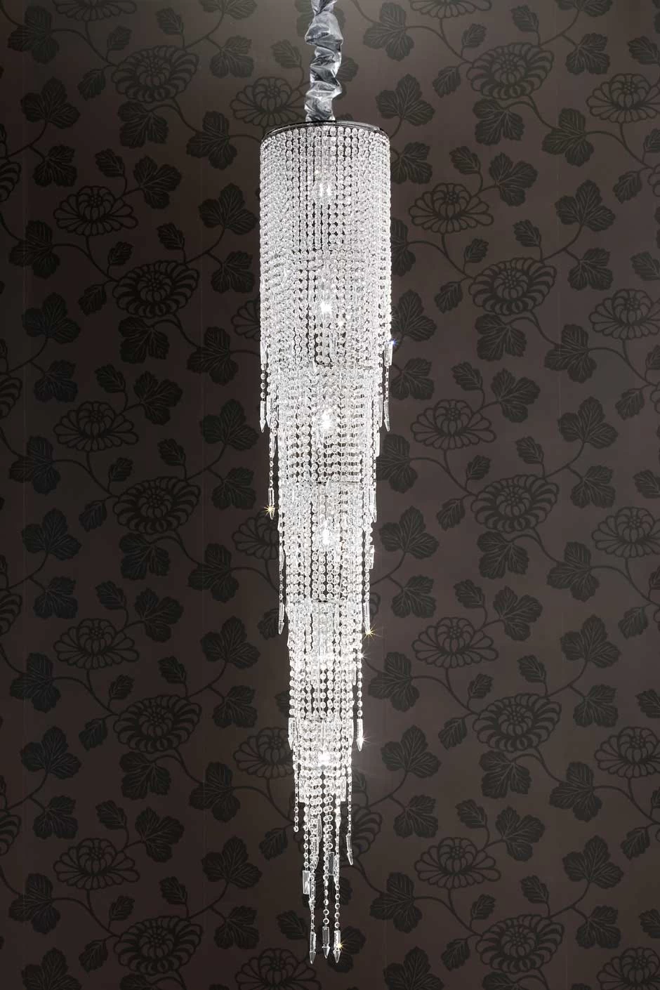 Ce grand lustre en cristal est constituĂ© de cristaux taillĂ©s en diamant rond et flèche montĂ©s sur des fils d’acier verticaux. La longueur des diffĂ©rents fils permet de donner une forme conique Ă ce lustre. La lumière produite par les six ampoules Ă©quipant ce luminaire se reflète dans cette multitude de cristaux pour produire des scintillements extraordinaires. La partie supĂ©rieure de ce plafonnier est rĂ©alisĂ©e en inox poli. Elle est circulaire, de 30cm de diamètre.