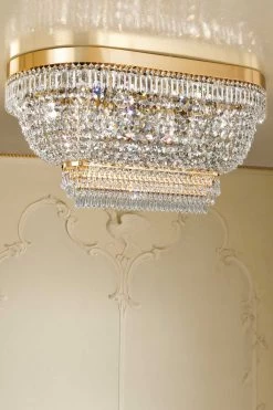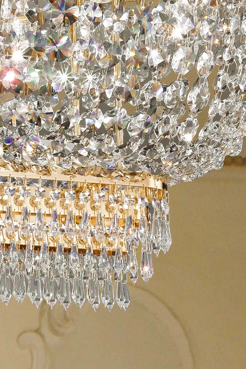 Ce très Ă©lĂ©gant plafonnier ovale associe de nombreux Ă©lĂ©ments de cristal taillĂ©s en diamant rond, ovale et rectangulaire. Ces Ă©lĂ©ments de cristal sont tenus par des fixations serties en mĂ©tal dorĂ©. L’ensemble prend une forme ovale. La partie supĂ©rieure de ce plafonnier est entourĂ©e d’un bandeau en mĂ©tal dorĂ© poli. La partie infĂ©rieure est soulignĂ©e par un Ă©lĂ©ment horizontal en mĂ©tal dorĂ©, auxquels sont accrochĂ©es de très nombreuses pampilles en cristal taillĂ©. Avec une hauteur de 50cm, ce plafonnier peut ĂŞtre installĂ© sous des plafonds d’une hauteur supĂ©rieure ou Ă©gale Ă 2m60. La beautĂ© de ce plafonnier provient notamment de l’effet de scintillement produit par les reflets de la lumière sur les innombrables facettes des Ă©lĂ©ments de cristal qui le composent. EquipĂ© de 14 ampoules, ce luminaire peut fournir une lumière considĂ©rable et ainsi Ă©clairer les plus vases espaces.