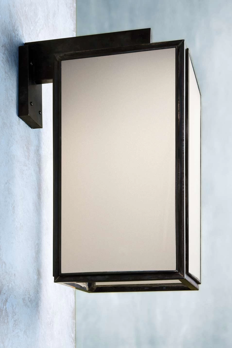Majestueuse, cette grande applique d’extérieur de 51cm de hauteur est réalisée en bronze, assemblée à la main et teintée d’une patine sombre appelée bronze antique. Munie de quatre faces en verre dépoli, cette applique d’extérieur produit une belle lumière homogène, non éblouissante. Elle éclaire avec distinction à la fois la façade sur laquelle elle est fixée, mais aussi les abords de votre demeure. Pour un résultat encore plus élégant, elle est équipée d’une ampoules décoratives fournissant une couleur légèrement dorée qui met en valeur le revêtement de votre façade. Cette applique d’extérieur est suspendue à une potence également en bronze, géométrique, sobre et discret. Rigoureusement assemblée, cette applique est adaptée à un usage extérieur contre façade, en étant conforme au niveau d’étanchéité IP43.