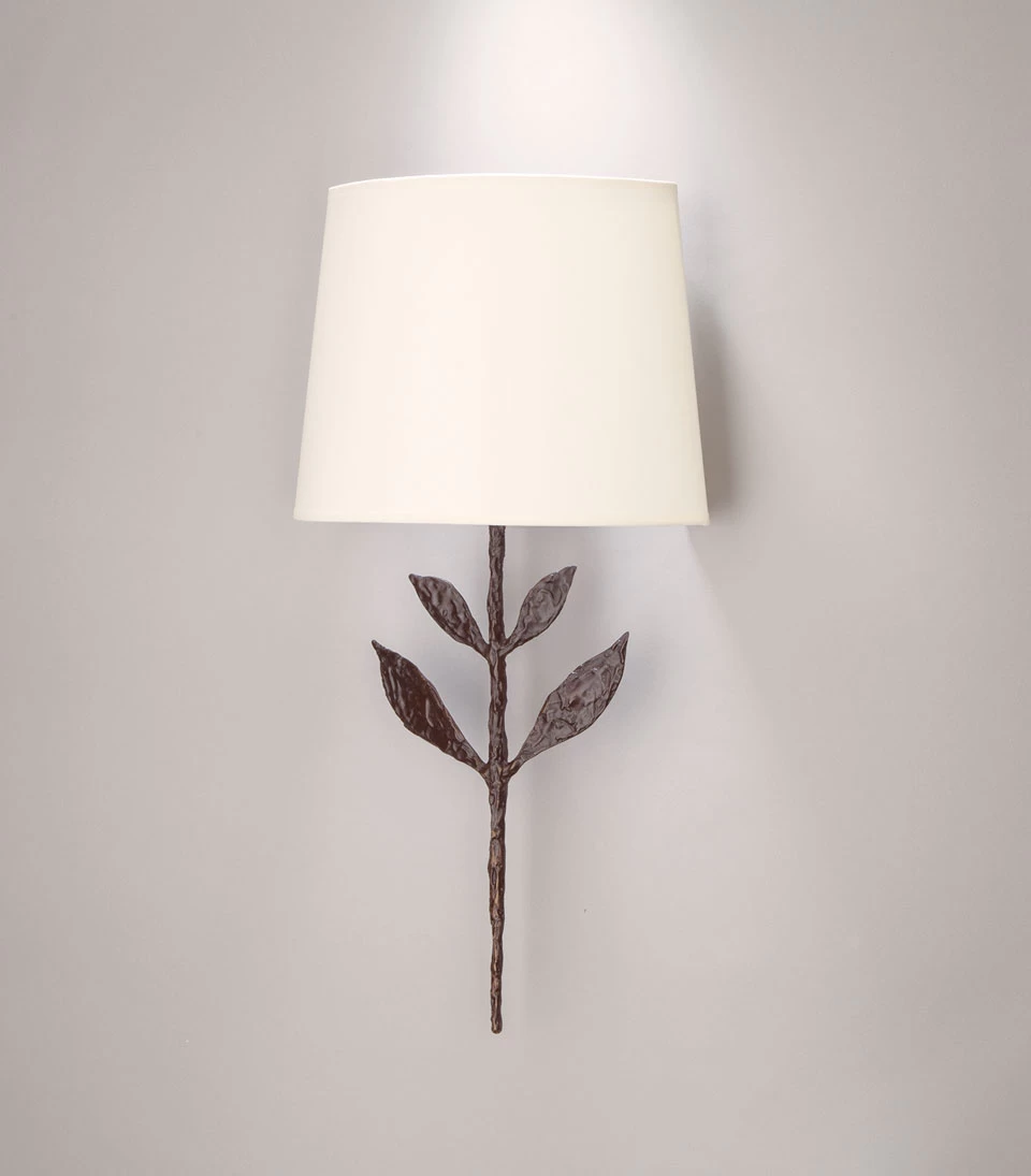Silva grand modèle est une applique en bronze noir patiné représentant une fleur, le support mural en forme de tige munie de feuilles stylisées et la source de lumière symbolisant la fleur. L’abat-jour blanc, ovale et peu profond permet l’installation de cette applique dans un lieu de passage ou un couloir étroit. Le bronzier Augustin Granet aime s’inspirer de la nature pour réaliser sa collection de luminaires dont la sobriété souligne l’élégance et la noblesse. Par défaut, ce luminaire est livré avec l’abat-jour proposé sur cette image mais le tissu peut être choisi dans le nuancier visible en photo complémentaire sur cette page, choix à préciser dans les informations spéciales de votre formulaire de commande. Cette applique est disponible en deux tailles dans les options de commande au bas de cette page, en dorée sous la référence 17090305 et en nickel satiné sous la référence 17090307.