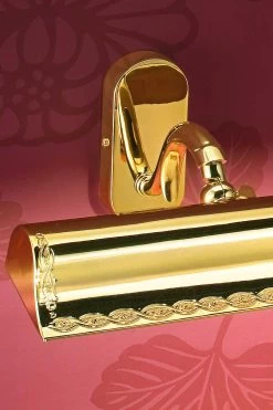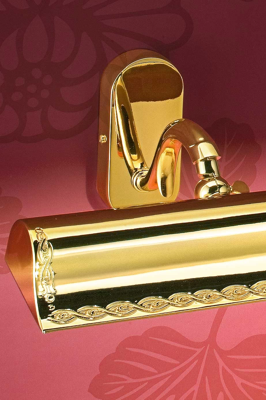 Cette grande applique pour éclairage de tableau est constituée d’un corps de forme évasée en métal doré. Les extrémités sont soudées et polies. Les bras, également en métal doré poli, prennent une forme courbée très gracieuse. Une discrète rotule permet de modifier l’orientation de cette applique. Les deux supports muraux sont de forme ovale. La hauteur hors tout de cette applique n’est que de 15cm – elle peut donc être installée dans des cas où la place disponible entre le haut du tableau et le plafond est limitée.