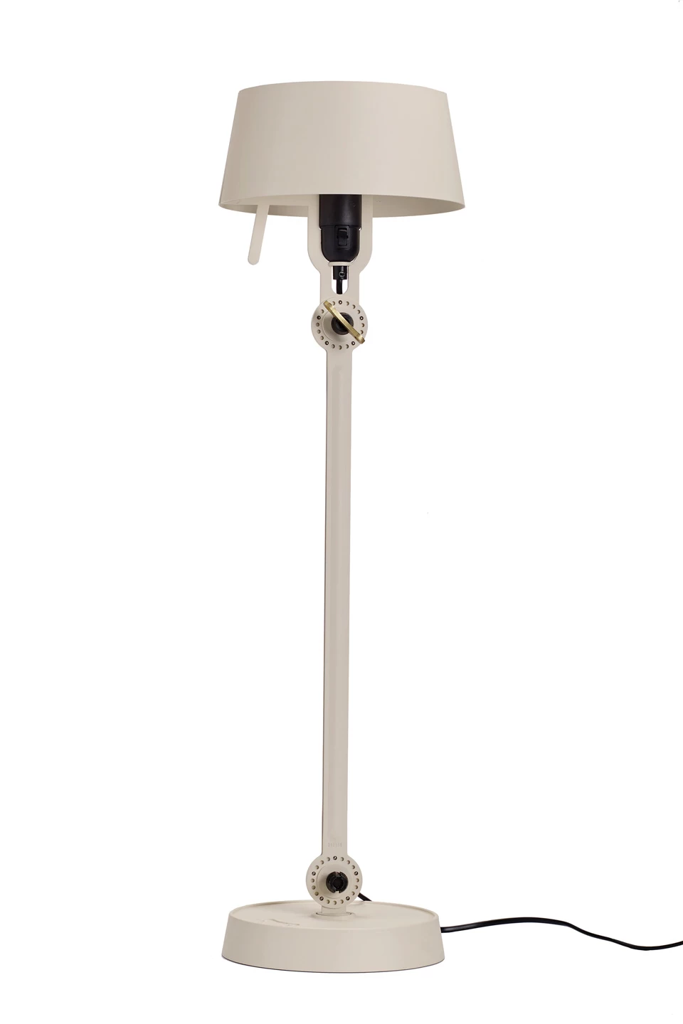La grande lampe de table Bolt en acier grainé écru style industriel a la particularité d’avoir deux rotules crantées qui permettent l’orientation de la tête et du pied. Elle peut ainsi être utilisée en lampe de bureau ou en chevet. Une petite poignée en acier permet d’orienter l’abat-jour très facilement. Son socle massif et d’un petit diamètre lui apporte stabilité et la possiblité de l’ installer sur un meuble étroit. Le luminaire est livré avec un très bel outil papillon siglé avec la marque TONONE et chaque lampe est numérotée. L’outil papillon est doré par défaut, mais disponible également à la demande en noir, cuivre, ou acier. Cette lampe est disponible en 7 couleurs et 2 tailles, dont noir visible sous la référence 17090131, en bleu orage sous la référence 17090132, en gris sous la référence 17090133, en kaki sous la référence 17090135, en vert kaki sous la référence 17090135 et en blanc pur sous la référence 17090137. D’autres modèles proposent différentes combinaisons de bras, de modes de fixation et de tailles.