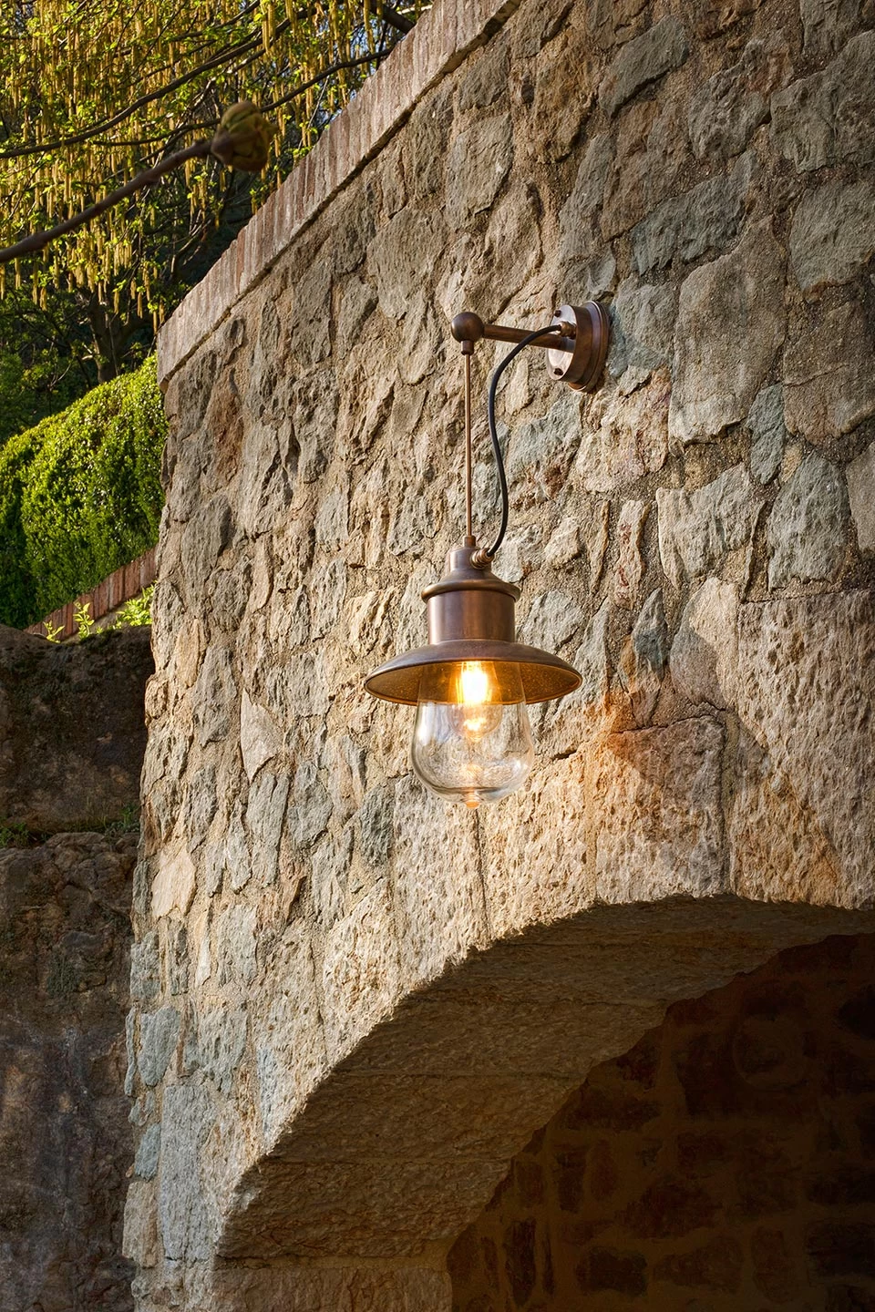 Issue de la collection guinguette aux inspirations champêtres, cette applique gamme Campagne d’extérieur est munie d’un large globe en cloche de verre transparent dans lequel est logée l’ampoule, coiffé d’un réflecteur circulaire évasé réalisé en laiton avec une belle finition vieilli qui donne une patine au modèle. La lampe est suspendue au bout d’une câble métallique, relié à un bras horizontal et un support mural circulaire en laiton vieilli, auquel le câble d’alimentation est directement connecté. Le modèle est équipé d’une protection IP65 qui garantie une excellente résistance aux intempéries. La maison italienne Aldo Bernardi développe une collection de luminaires outdoor intemporels et de grande qualité, inspirés de techniques de fabrication artisanales de la région d’Aloso.