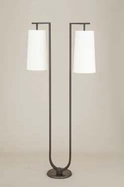 Superbe design épuré pour ce modèle de lampadaire 2 lumières Gustave, un style classique qui évoque une ambiance antique avec la symétrie de sa structure de bronze massif patiné et ses 2 grands abat-jour blancs. Le modèle est doté d’un socle rond surmonté d’un U allongé dont les empattements sont les points de fixation pour les deux abat-jour très légèrement coniques en chintz écru. Remarquez la finition bronze patiné, une finition issue de la fonderie d’art obtenue par oxydation à chaud du bronze qui est teintée puis cirée, offrant une protection inaltérable et une couleur chaude et naturelle.