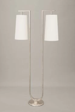 Superbe design épuré pour ce modèle de lampadaire argenté 2 lumières Gustave, un style classique qui évoque une ambiance antique avec la symétrie de sa structure de bronze massif finition nickel et ses 2 grands abat-jour blancs. Le modèle est doté d’un socle rond surmonté d’un U allongé dont les empattements sont les points de fixation pour les deux abat-jour très légèrement coniques en chintz écru. Remarquez la finition bronze nickel, une finition argentée obtenue par un travail de polissage du bronze créant un contraste entre les arrêtes rendues brillantes et les creux naturels du métal laissés mats, ensuite magnifié par une fine couche de nickel appliquée à l’électrolyse (le nickel privilégié à l’argent car celui-ci a tendance à s’oxyder rapidement).