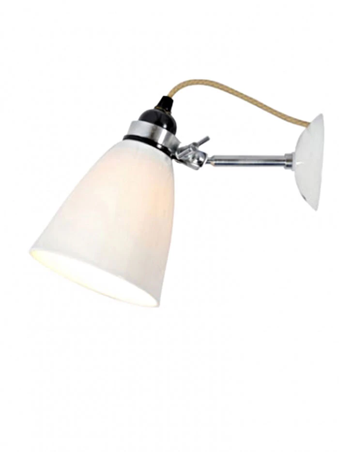 Cette applique Ă abat-jour en porcelaine blanche appartient Ă la gamme Hector, d’un style typiquement britannique. Elle est Ă©quipĂ©e d’un abat-jour en forme de coupole de 12cm de diamĂštre, fabriquĂ© en porcelaine translucide d’une grande finesse. Le fil d’alimentation est recouvert de tissu, et est reliĂ© directement Ă la tĂȘte de la lampe. L’ensemble bĂ©nĂ©ficie d’une remarquable qualitĂ© de fabrication, et d’un design indĂ©modable. Cette applique produit Ă la fois une lumiĂšre dirigĂ©e et un doux Ă©clairage d’ambiance, grĂące Ă la semi-transparence du rĂ©flecteur.