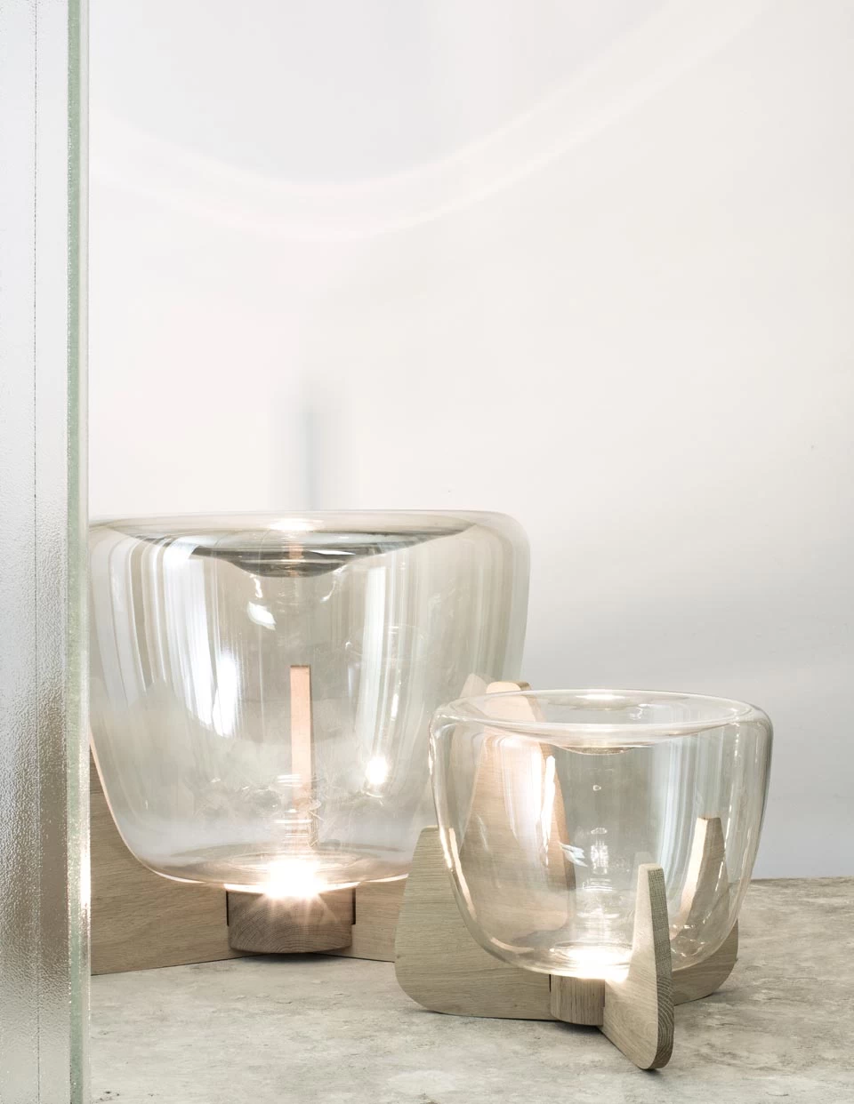 Superbe petite lampe de table Devotion de la série Ice, toute en rondeur, qui s’inspire d’un chocolat praliné belge qui a donné son nom à la collection. La lampe se compose d’un volume de verre transparent réalisé grâce à l’exceptionnelle maîtrise des technique traditionnelles de verre soufflé à la bouche. Le réflecteur est encastré sur un trépied délicat mais solide en bois avec une finition laissée naturelle, qui lui donne une tonalité claire. La source de lumière LED est enchâssée dans le bois. Très joli modèle idéal pour amener une touche épurée et lumineuse à une pièce de vie ou encore une chambre.
