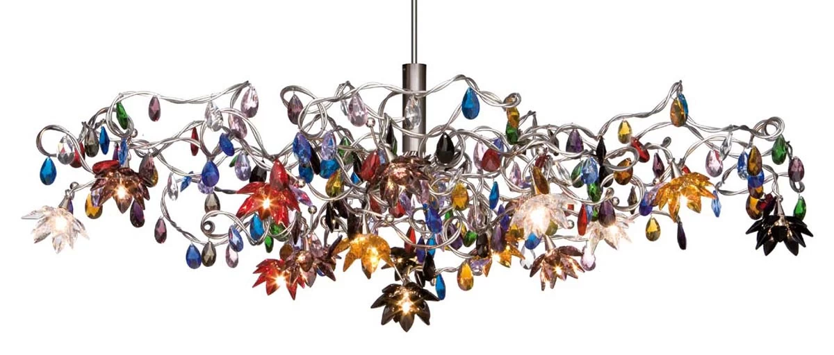 Le lustre Jewel multicolore 15 lumières tout en verre de couleur est juste époustouflant. Les gammes Jewel et Jewel Diamond sont en fil d’acier inox de 2 et 3mm et entièrement faites à la main. Chaque branche est décorée avec plusieurs cristaux.