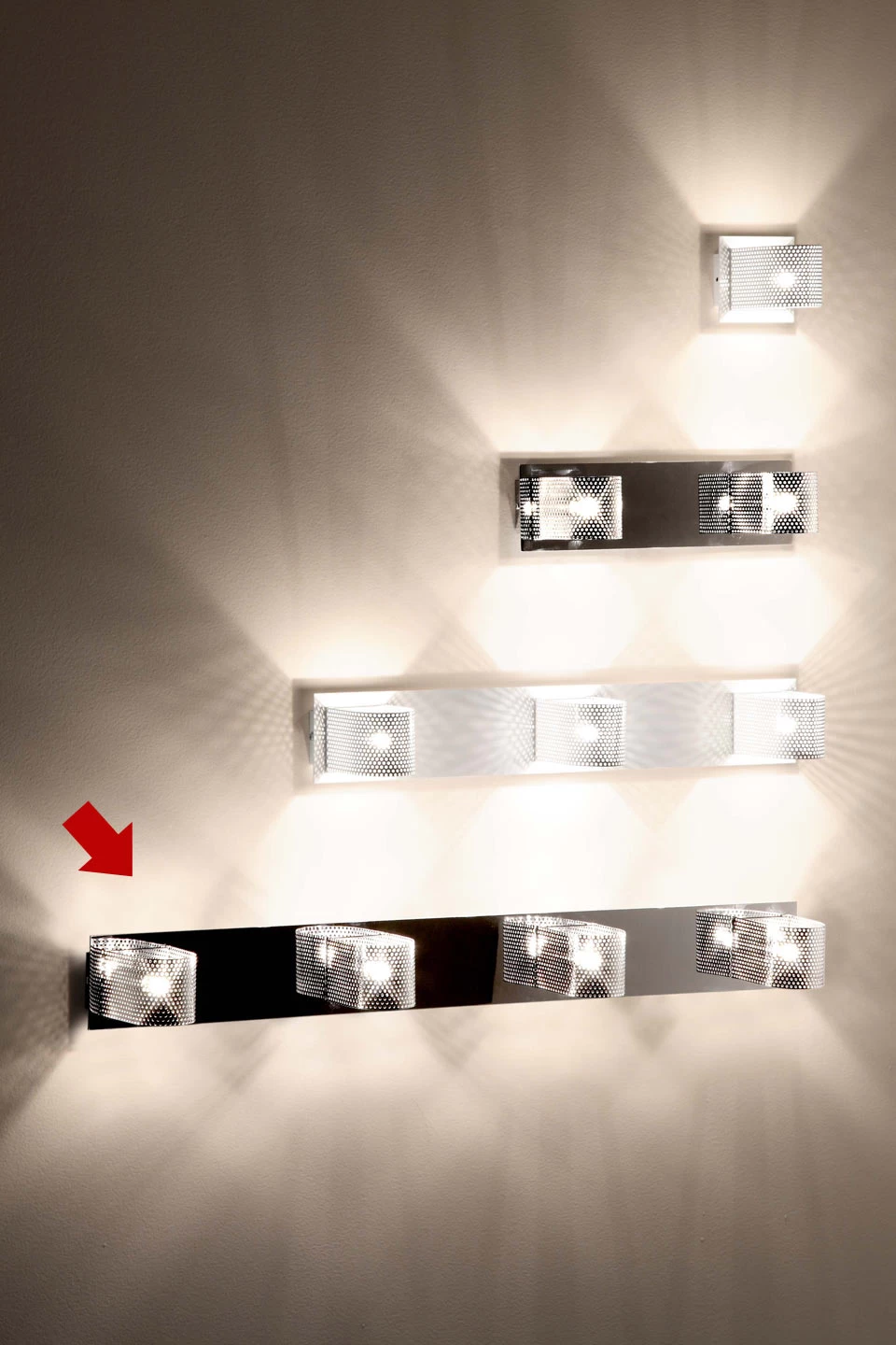 Dimension de l’applique double Kendo W2 chromée: hauteur 10cm, longueur 90 cm, saillie-distance au mur 12cm