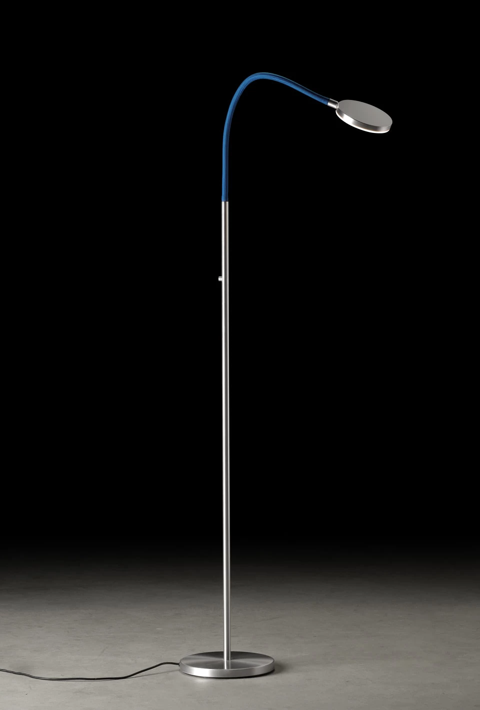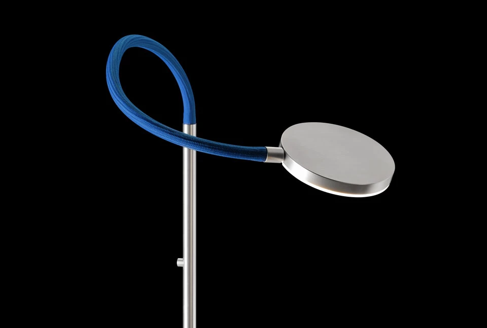 Le lampadaire Nova Flex aluminium mat sĂ©duit par son design contemporain Ă©lĂ©gant et minimaliste et par l’aspect pratique des possibilitĂ©s d’orientation de la lumière qu’il offre grâce Ă son bras flexible bleu et son Ă©clairage LED intĂ©grĂ©. Le modèle se prĂ©sente sous la forme d’un lampadaire simple avec socle rond et pied droit en tube aluminium mat, surmontĂ© d’un bras flexible gainĂ© de textile bleu qui permet d’orienter la lumière produite par le module LED intĂ©grĂ© dans un disque aluminium mat. Nova Flex est Ă©quipĂ© d’un variateur de lumière intĂ©grĂ© qui permet de bĂ©nĂ©ficier de la puissance de l’Ă©clairage LED tout en pouvant crĂ©er une atmosphère plus tamisĂ©e. Non seulement rĂ©putĂ©e pour la qualitĂ© de ses luminaires fabriquĂ©s du mĂ©tal brut au produit fini en Allemagne, la maison Holkoetter, fondĂ©e en 1964, concentre Ă©galement son expertise sur le dĂ©veloppement d’un Ă©clairage LED prĂ©cis, durable et tendant vers le vertueux en terme environnemental.