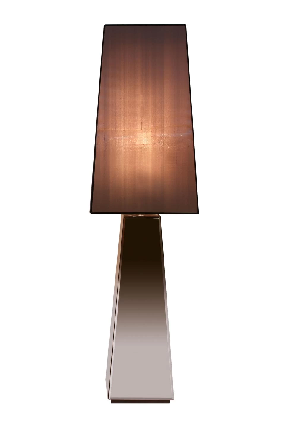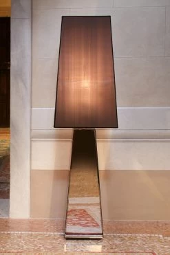 Ce lampadaire pyramide baptisé Narciso est muni d’un pied recouvert de miroir fumé biseauté. Son épaisseur réduite à 30cm permet de réduire l’encombrement. Ce lampadaire est muni d’un abat-jour trapézoïdal tendu d’un fin taffetas de coton taupe. Il existe une lampe assortie, visible sous la référence 13060130.