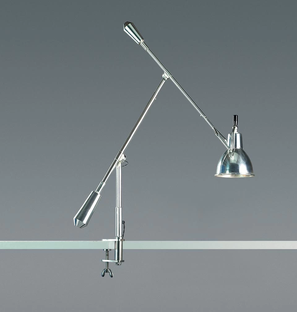 Le célèbre modèle de lampe de bureau EB27 à double balancier en métal chromé de E. Buquet est ici proposé muni d’un étau pour la fixer sur le coin d’une table ou d’une étagère. Ces deux longs bras munis de contrepoids et le réflecteur sont articulés afin de diriger le faisceau lumineux avec précision. L’intérieur du diffuseur est laqué blanc. Fabriquée artisanalement en Italie, cette lampe est la reproduction parfaite du modèle original des années 30. Cette lampe est également disponible avec un socle en bois sous la référence 17060011.