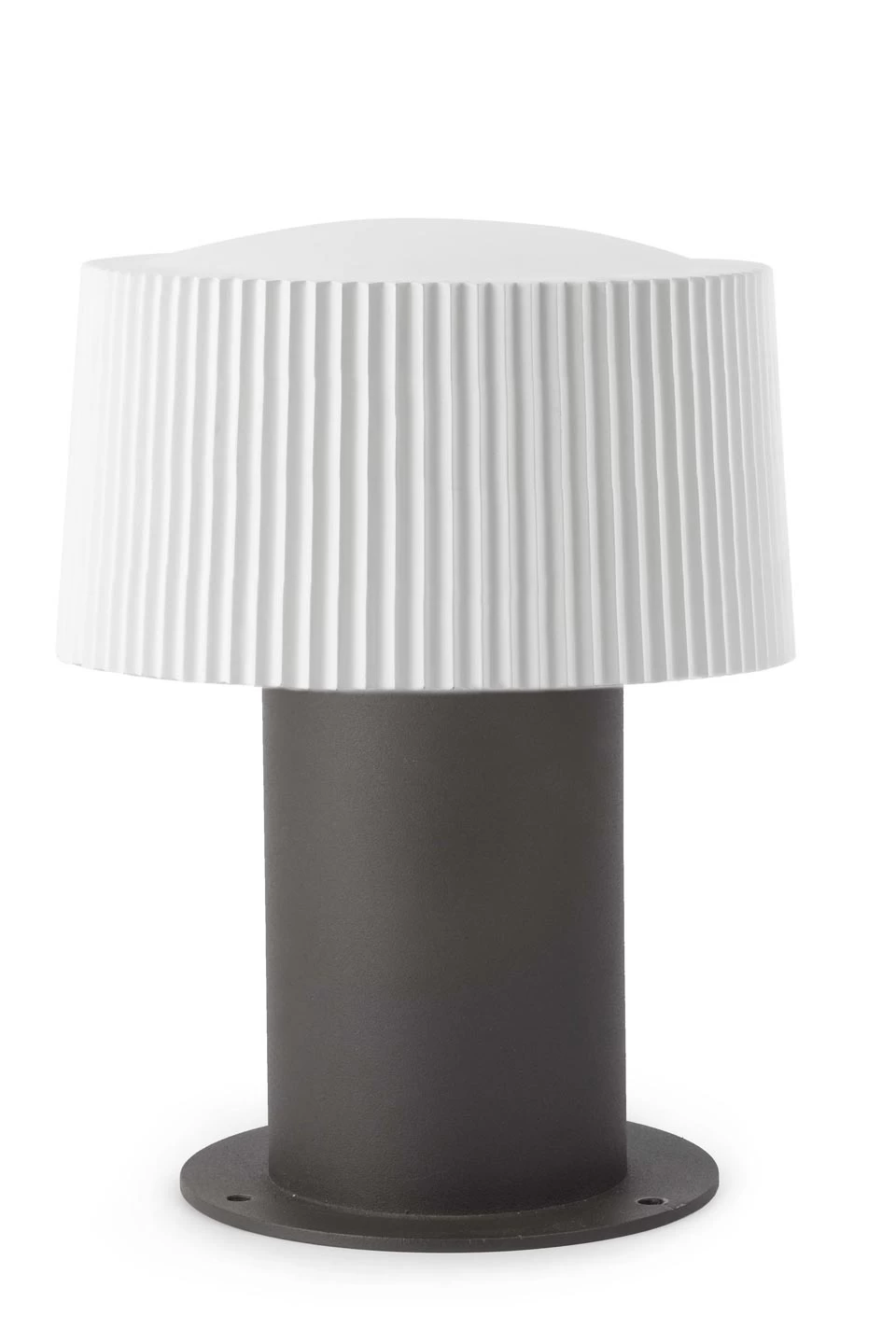 Cette charmante lampe pour le jardin est constituée d’un support en aluminium laqué gris foncé, sur lequel est fixé un très élégant diffuseur en forme d’abat-jour plissé. Cette lampe est parfaite pour une installation sur un muret, ou un support maçonné. Le diffuseur est réalisé en résine acrylique à l’aspect du verre satiné – mais cette matière est beaucoup plus résistante aux chocs. Elle homogénéise très agréablement la lumière produite par une ampoule à base consommation de 20W – dont la puissance lumineuse est équivalente à celle d’une ampoule à incandescence de 100W. Le support, en aluminium, est très solide. L’ensemble est étanche aux intempéries (niveau IP44) – cette lampe de jardin est faite pour durer! Le support ne mesure que 14cm de diamètre, son installation est très aisée. Il existe dans cette collection une applique d’extérieur et un petit et très élégant lampadaire d’extérieur, visibles sous la référence 12030702.