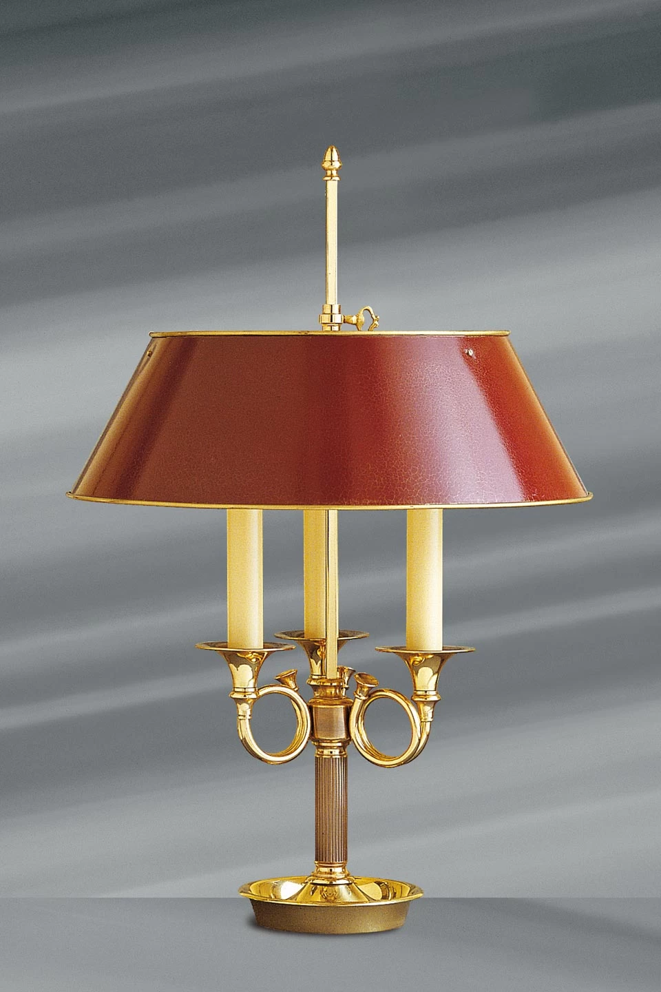 Trois cors de chasse portant lumières, voici l’élément très original de cette lampe de style Directoire en bronze massif. Son corps cannelé contraste avec la brillance parfaite de la finition or vif de son pied, et du rouge vif brillant de son abat-jour. Cette lampe a été moulée au sable. Les moules utilisés, le sont une seule fois pour garantir la précision des décors. Le montage et les finitions sont entièrement manuels et est garanti par le savoir-faire des artisans d’art de la maison Lucien Gau, entreprise artisanale défendant son activité manufacturière, emblématique du patrimoine de la France.
