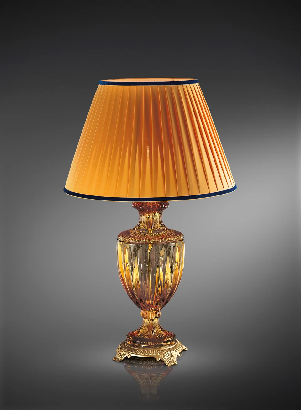Un magnifique style classique pour cette lampe de table dotée d’un socle sculpté en métal finition or mat, surmonté d’un vase en cristal ambré, ce qui crée un superbe prisme lumineux et chaleureux, et d’un bel abat-jour conique en tissu orange délicatement plissé et liseré de bleu très chic. La maison Italamp propose une diversité de collections qui mettent (littéralement !) en lumière et développent le riche héritage artisanal italien en matière de luminaire, avec la recherche de matériaux nobles et le mariage du classique et du contemporain en d’uniques designs.