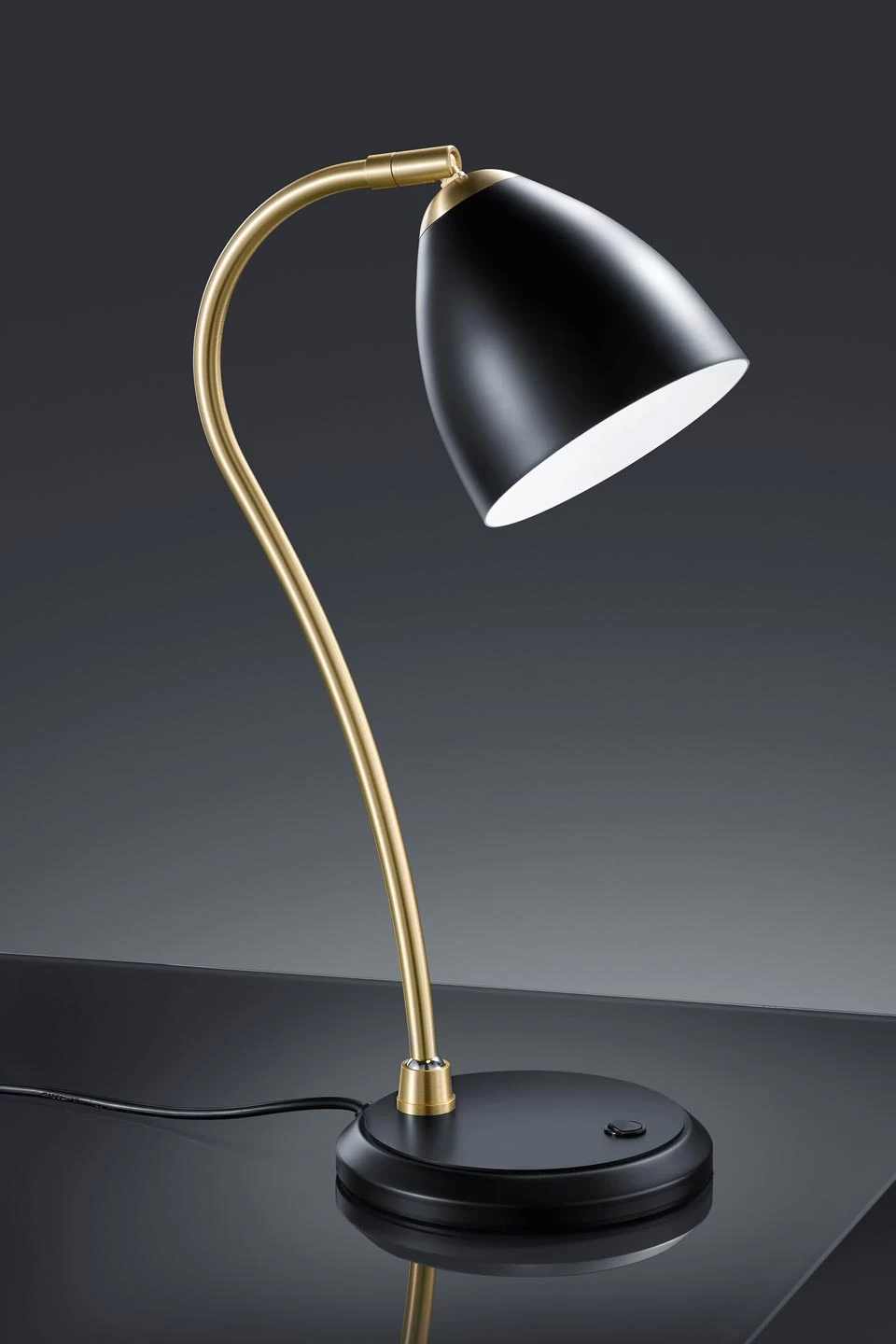 Un très beau travail et un design classique pour cette lampe de table noire et laiton satiné. Elle se compose d’une tige courbe en laiton doré et d’un diffuseur en métal noir mat. Celui-ci est inclinable et en forme de tulipe et présente un intérieur blanc. Son socle rond, également en laiton noir, est muni d’un interrupteur. Le fil d’alimentation électrique est noir. Ce luminaire, fabriqué dans les ateliers Baulmann Leuchten en Allemagne bénéficie d’une réalisation très soignée. Orientable à votre guise, elle assurera un éclairage parfait dans votre intérieur et conviendra à tout style. Existe également en laiton mat blanc sous la référence 16010105.