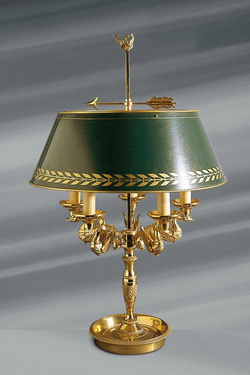 Tout l’impérialisme flamboyant se reflète dans cette lampe en bronze massif de style Empire dont cinq cygnes triomphants portent lumières. Sa patine vieil or accentue le relief et la force de son décor. De son socle poli et brillant, creusé pour accueillir la cire de jadis, jailli un pied renflé et sculpté. Il porte les cygnes soutenant les lumières, ainsi que la tige réglable, soutenant l’abat-jour vert Empire et doré. Une superbe flèche horizontale le surmonte, traversant la tige terminée par un petit cygne triomphant. Dans le même esprit, une lampe à trois lumières est visible sous la référence 16060119.