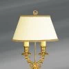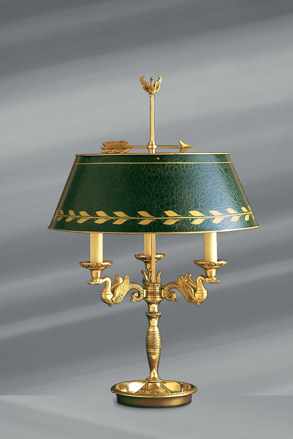 Flamboyante, cette lampe de style Empire, en bronze massif à trois lumières portées par des cygnes triomphants, à la finition vieil or patiné. Son abat-jour vert Empire est ourlé d’une frise dorée reprenant le motif des plumes de la flèche qui le surmonte. Un petit cygne glorieux surplombe le tout. Son pied renflé est magnifiquement martelé en sa partie centrale, poli et brillant pour le reste. Il semble jaillir du centre de son socle, lui aussi brillant, comme l’eau d’une fontaine. Le dessin remarquable de cette lampe et son exécution parfaite, sont le fruit du travail exceptionnel des artisans d’art de la Maison Lucien Gau qui, pour chacun de ses métiers, dessin, fonderie, tournure, monture et ciselure met en œuvre la totalité de son savoir-faire issus des méthodes les plus traditionnelles. Dans le même esprit, une lampe à cinq lumières à la finition vieil or patinée est visible sous la référence 16060120, une version plus épurée mais de même style est visible sous la référence 16060121.
