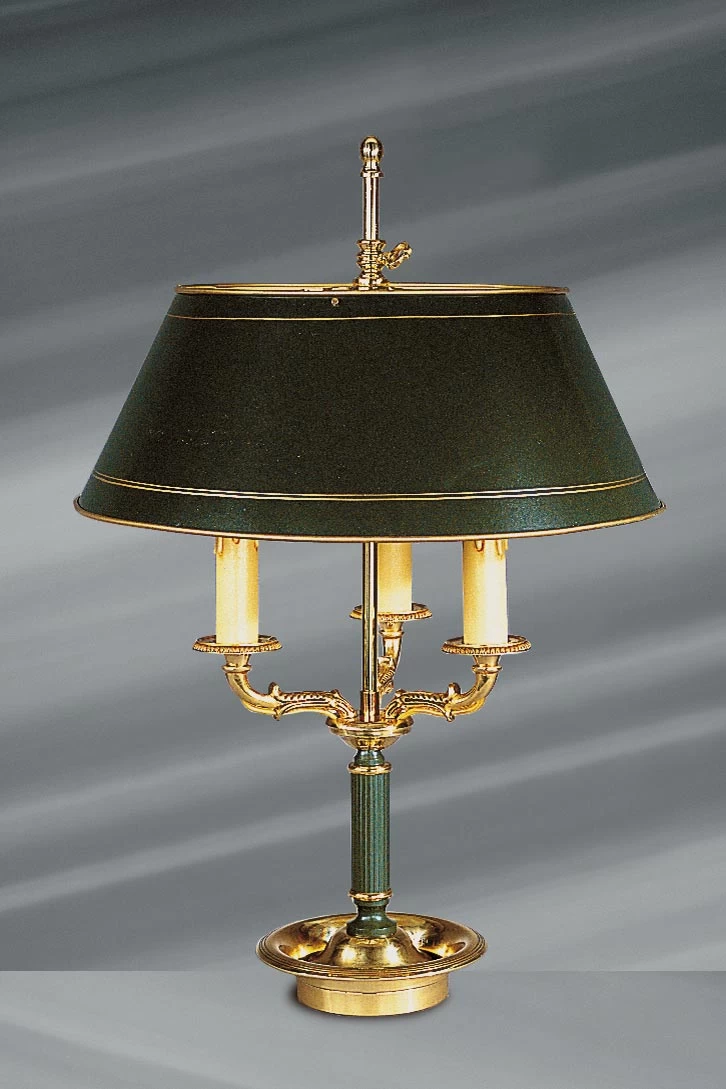 Sobre et élégante est cette lampe en bronze massif de style Empire à trois lumières et abat-jour laqué. Celui-ci peut être, à la demande laqué en vert ou bordeaux. Son socle brillant, épais est creux étant destiné à recevoir la cire coulant des bougies. Son pied cannelé et laqué terminé par une coupelle d’où partent trois bras, décorés pour partie, portant lumières au dessus de bassins plats ourlés de détails de feuilles ciselées. L’abat-jour, surligné de lignages dorés, est soutenu par une baguette métallique réglable. L’ensemble est gracieux, l’éclairage présent, la réalisation parfaite. Elle est assurée par les artisans de la Maison Lucien Gau, entreprise du Patrimoine vivant, mettant tradition et innovation au service de sa clientèle. Dans le même esprit, une lampe à trois lumières, un peu plus petite, laquée en bordeaux est visible sous la référence 16060135