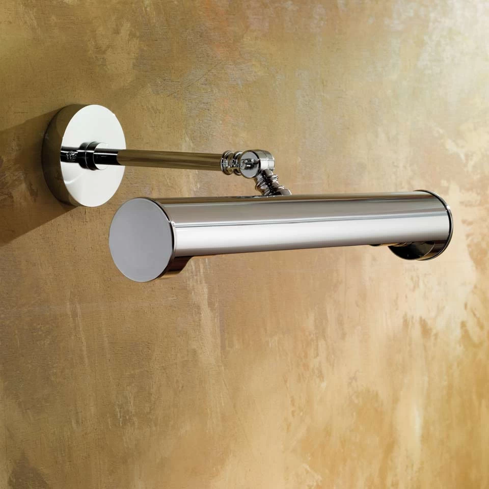 Picture Light est une collection de très élégants et discrets luminaires d’éclairage de tableau. Impeccablement réalisés en bronze, ils sont constitués d’un support mural circulaire d’un grande sobriété, auquel est fixé une tige tubulaire horizontale, à l’extrémité de laquelle une rotule permet d’ajuster l’orientation de la tête d’éclairage. On peut ainsi orienter précisément le faisceau de lumière produit. Ces luminaires d’éclairage de tableau sont disponibles en deux largeurs, 21cm et 33cm. Ils peuvent être choisis en bronze antique référence 11060165 ou dans un magnifique bronze chromé.