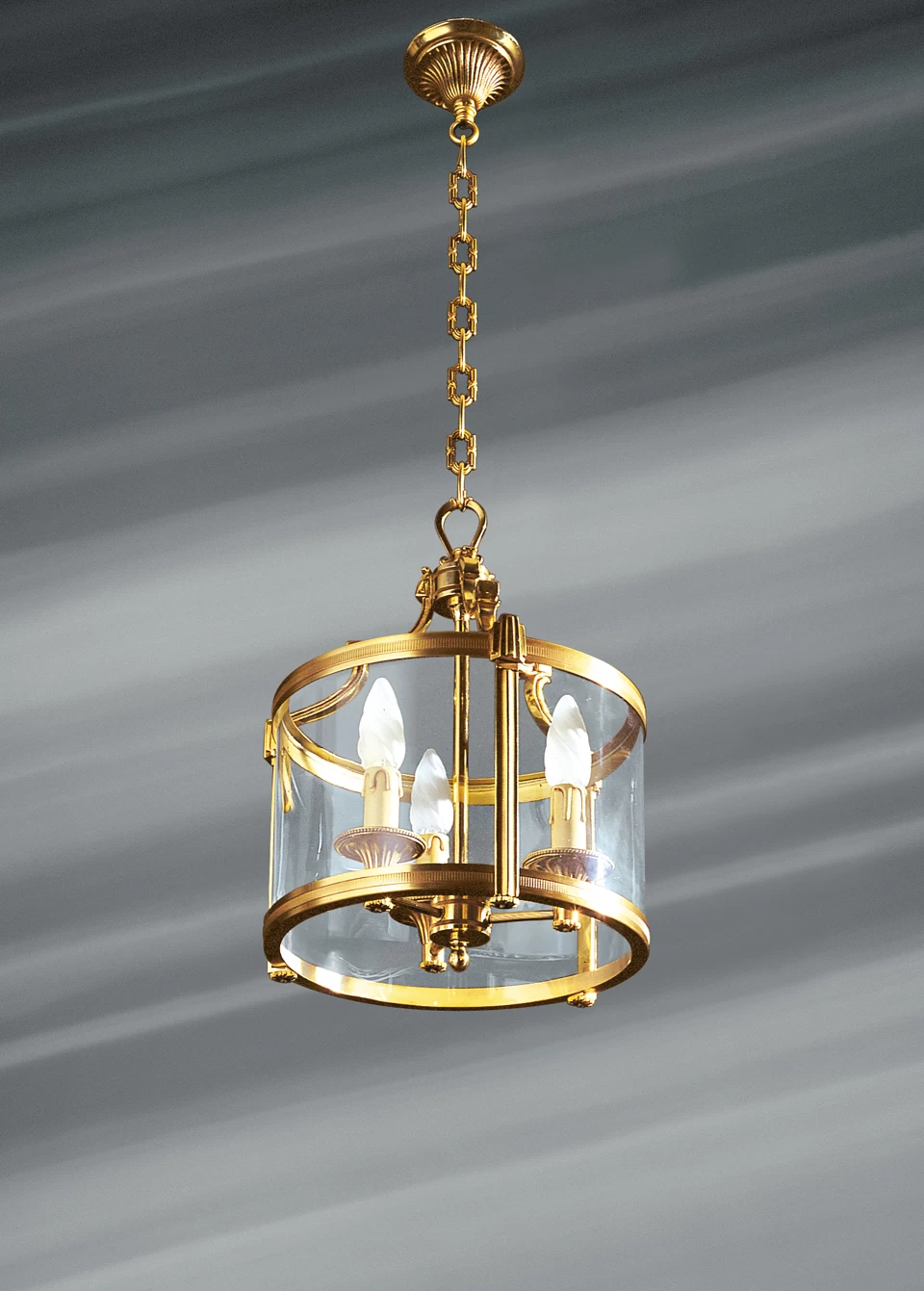 Originale par sa faible hauteur, transparence et éclat sont les maîtres mots pour caractériser cette lanterne, au bel équilibre. Les trois lumières encerclées de verre exaltent l’éclat du bronze massif qui compose toutes les parties métalliques. Les cercles qui soutiennent le verre sont précisément sculptés pour laisser apparaitre une rangée de fines cannelures. Les bras portant bougies ont la forme de simples tiges striées sur toute leur longueur. Les bassins joliment travaillés viennent s’y emboiter. Ils sont terminés par de fins colliers de perles. Les portants de la lanterne se rejoignent au point d’ancrage après deux originales courbures. Les maillons de la chaînes sont striés et liés, et de forme hexagonale. La décoration et le détail se nichent jusque dans le cache piton soigneusement strié lui aussi. Cette passion du détail et du travail bien fait est la signature de la Maison Lucien Gau, orfèvre en la matière depuis six générations.