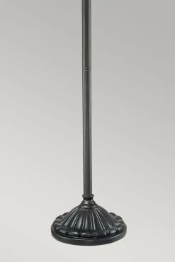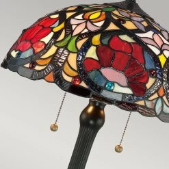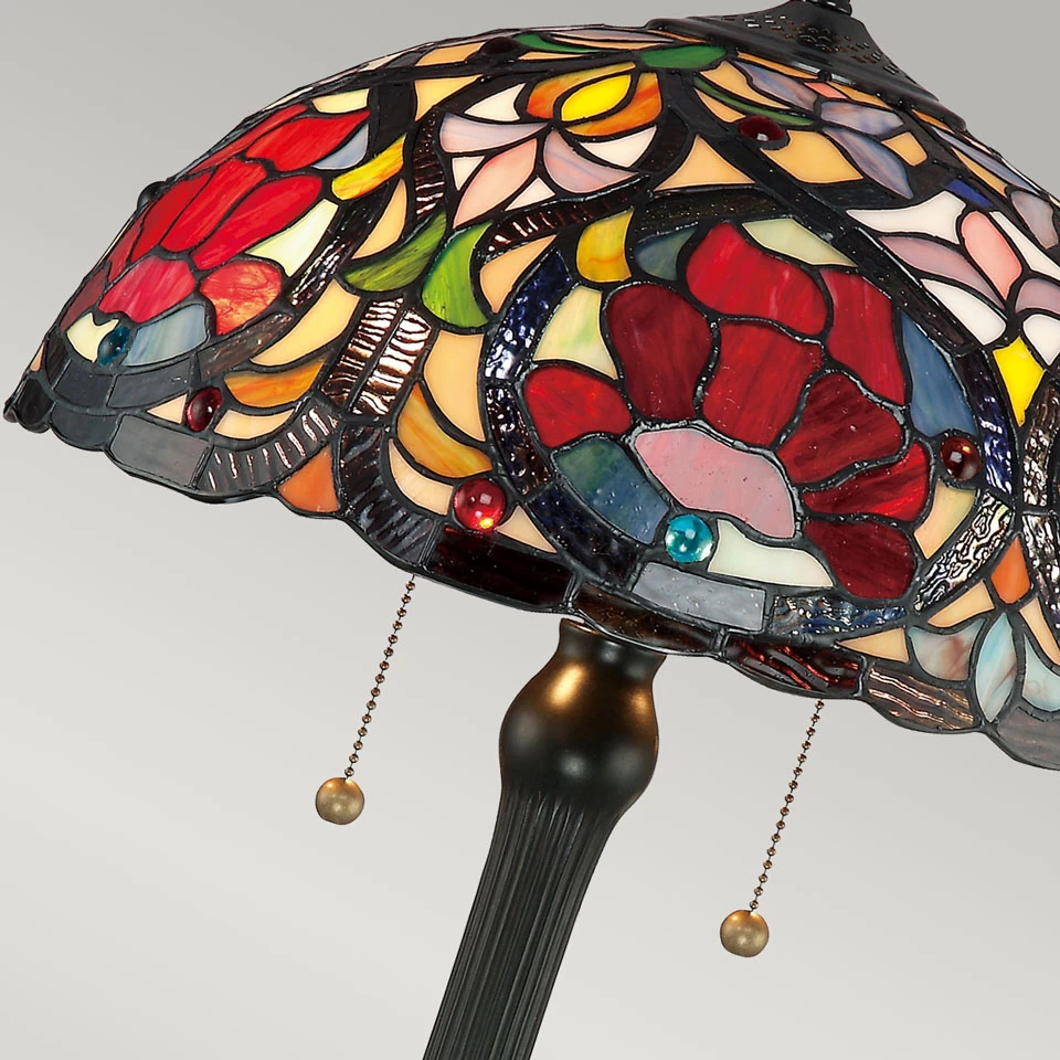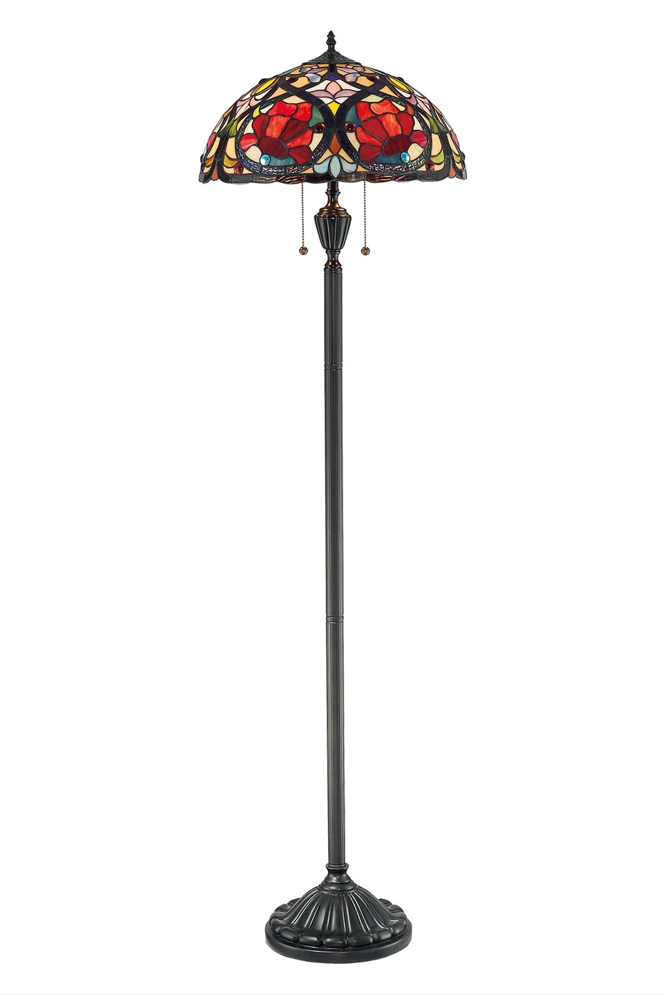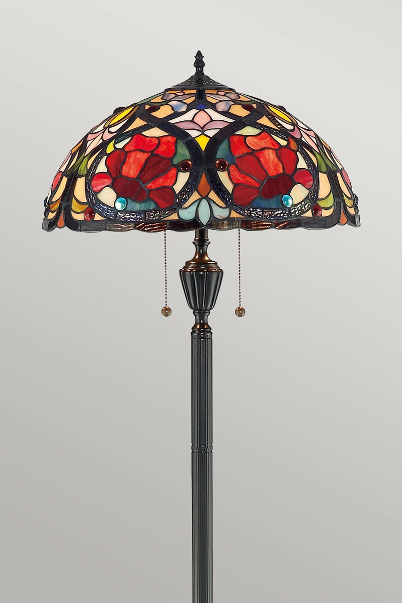 Magnifique lampadaire Larissa de style Tiffany, avec abat-jour en verre aux motifs floraux typiquement Art Nouveau et un pied finition bronze. Le modèle est composĂ© d’un socle en cloche moulĂ©e et d’un pied droit, surmontĂ© d’un superbe abat-jour en dĂ´me fait de 426 pièces de verre colorĂ©, reprĂ©sentant de grosses roses rouges et une multitude de petites fleurs et feuilles dans des tons de verts, mauves, bleus. L’abat-jour, selon la tradition de fabrication des lampes Tiffany, est composĂ© de pièces de verre coupĂ©es et limĂ©es Ă la main suivant la forme d’un gabarit puis assemblĂ©es entre elles grâce un joint en Ă©tain dans un moule de fibre de verre, qui lui donne sa forme finale. Le lampadaire est Ă©galement dotĂ© de deux petites chaines dorĂ©es qui servent d’interrupteurs et allument indĂ©pendamment chaque ampoule. L’impeccable fabrication est celle de la maison britannique Elstead lighting, connue depuis le XVIIème siècle comme les forges Elstead, aujourd’hui alliant la perpĂ©tuation des techniques artisanales Ă une vĂ©ritable modernitĂ© dans le design et la rĂ©alisation.