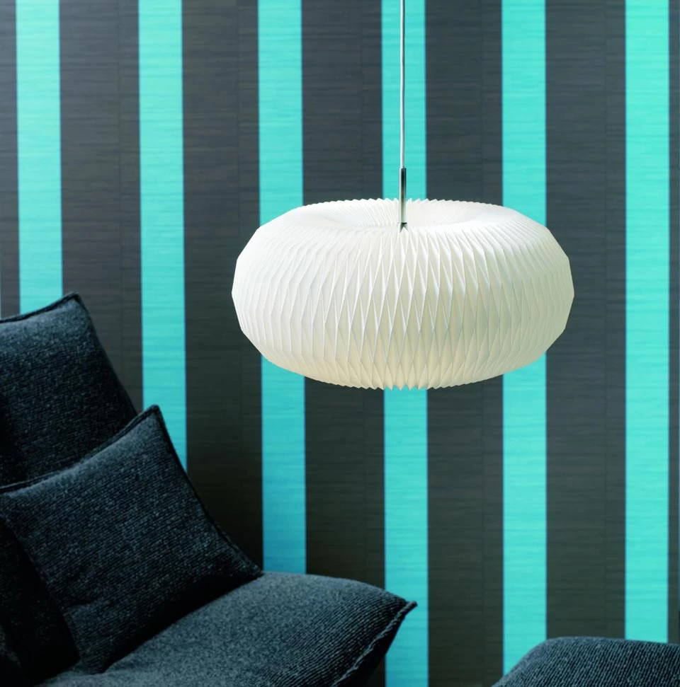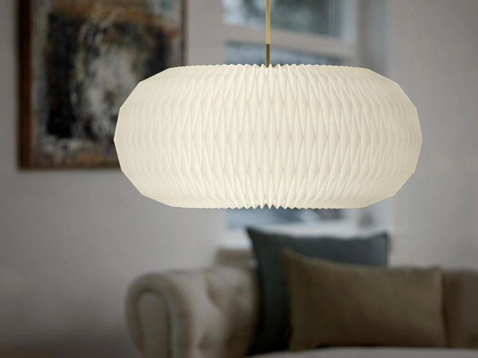 Superbe suspension Model 195, dotée d’un large réflecteur en forme de Donut réalisé en papier blanc délicatement plissé à la main. Son design nordique épuré et élégant est particulièrement intemporel et marqué par un motif géométrique en forme de losange créé par le pliage. L’abat-jour est surmonté d’une discrète pièce de laiton qui gaine la base du câble de suspension, et le donut est fermé de part et d’autre par un disque d’acier. La maison danoise Le Klint, qui produit ses luminaires dans ses ateliers d’Odense, travail depuis les années 1940 sur une production emblématique du design à la Scandinave et aujourd’hui considérée comme intemporelle.