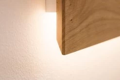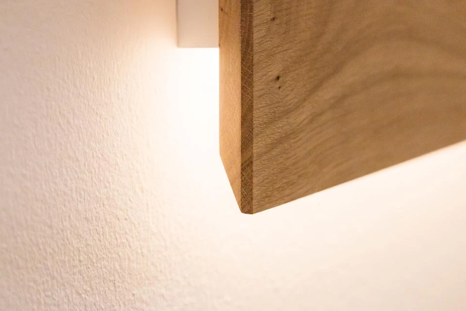 Grande applique Liiny de la collection WoodLED, au design minimaliste et épuré. Elle est composée d’un rectangle en chêne ou noyer, posé sur un socle étroit sur le mur. Un module LED blanc chaud est placé sous le disque, et produit une lumière indirecte, qui en fait un modèle idéal pour des pièces intimes. C’est un modèle dont la géométrie structure l’espace et a un vrai pouvoir décoratif.