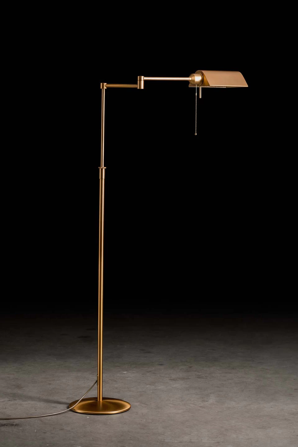Nous avons ici une classique liseuse à deux bras articulés et hauteur réglable dont l’originalité vient de sa finition laiton antique. Elle est munie d’un interrupteur chaînette directement connecté à la douille et posée sur un socle fin mais très stable. Cette liseuse est disponible en finition laiton antique ou dorée mate dans les options de commande au bas de cette page.
