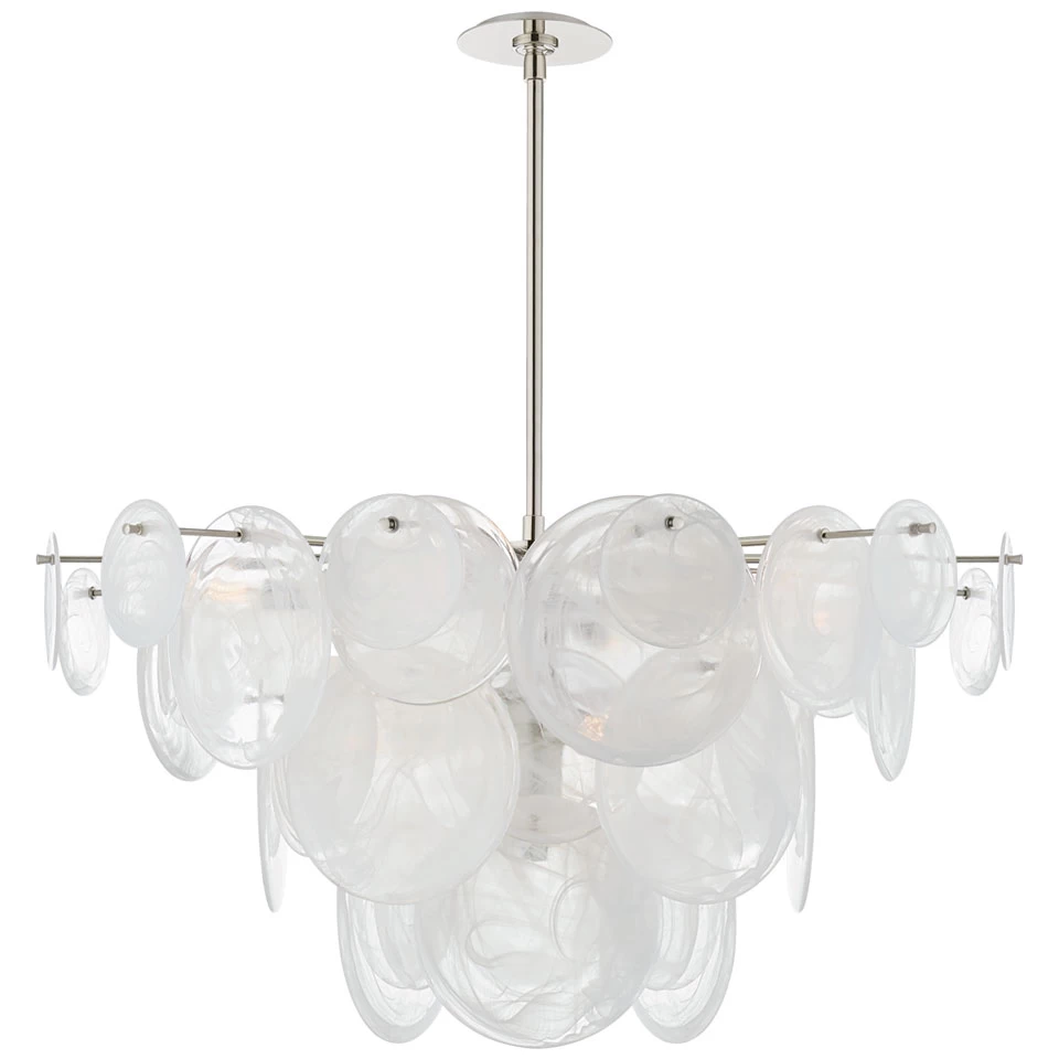 Un superbe mélange hypnotique d’éléments rétros et moderne avec ce lustre argenté Loire 9 lumières, doté d’une structure métallique finition nickel poli et d’une multitude de diffuseurs en disques de verre strié blanc. Le modèle est composé d’un support de plafond rond discret, d’une tige verticale autour de laquelle rayonnent de fines tiges horizontales sur lesquelles sont fixées les disques de verre strié blanc qui ensembles forment une pyramide inversée créant un superbe diffuseur cristallin qui propage la lumière de manière homogène. Loire est parfait pour illuminer une grande pi-ce ou pour mettre en valeur une belle hauteur sous plafond. Ce luminaire est signé AERIN, petite fille d’Estée Lauder, qui nous propose un univers fait de l’esprit chic et élégant des Hamptons, mêlé à des influences méditerranéennes.