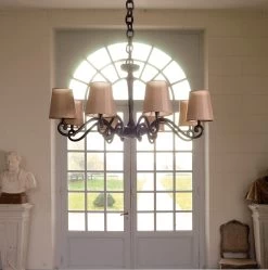 De belles volutes en bronze massif noir patinĂ© forment les 8 bras de ce lustre Amboise. Les bras sont attachĂ©s Ă un corps central massif et rond qui s’affine avant de s’attacher Ă une chaĂ®ne Ă gros maillons en bronze assortie. D’une hauteur minimum de 86cm, ce lustre convient sous des hauteurs de plafond minimum de 2,8m. Le bronzier Augustin Granet utilise des techniques de moulages issues de l’industrie qui apporte irrĂ©gularitĂ©s et force Ă la matière. Ce savoir-faire associĂ© Ă un design toujours Ă©lĂ©gant et Ă la noblesse du bronze nous offrent une collection de luminaires raffinĂ©s, destinĂ©s aux plus belles demeures. Par dĂ©faut, ce luminaire est livrĂ© avec l’abat-jour proposĂ© sur cette image mais le tissu peut ĂŞtre choisi dans le nuancier visible en photo complĂ©mentaire sur cette page, choix Ă prĂ©ciser dans les informations spĂ©ciales de votre formulaire de commande. Ce lustre est proposĂ© en bronze finition dorĂ©e sous la rĂ©fĂ©rence 17090350. Une chaĂ®ne de suspension additionnelle Ă vos mesures peut ĂŞtre commandĂ©e en option, nous contacter.