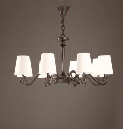 De belles volutes en bronze massif noir patinĂ© forment les 8 bras de ce lustre Amboise. Les bras sont attachĂ©s Ă un corps central massif et rond qui s’affine avant de s’attacher Ă une chaĂ®ne Ă gros maillons en bronze assortie. D’une hauteur minimum de 86cm, ce lustre convient sous des hauteurs de plafond minimum de 2,8m. Le bronzier Augustin Granet utilise des techniques de moulages issues de l’industrie qui apporte irrĂ©gularitĂ©s et force Ă la matière. Ce savoir-faire associĂ© Ă un design toujours Ă©lĂ©gant et Ă la noblesse du bronze nous offrent une collection de luminaires raffinĂ©s, destinĂ©s aux plus belles demeures. Par dĂ©faut, ce luminaire est livrĂ© avec l’abat-jour proposĂ© sur cette image mais le tissu peut ĂŞtre choisi dans le nuancier visible en photo complĂ©mentaire sur cette page, choix Ă prĂ©ciser dans les informations spĂ©ciales de votre formulaire de commande. Ce lustre est proposĂ© en bronze finition dorĂ©e sous la rĂ©fĂ©rence 17090350. Une chaĂ®ne de suspension additionnelle Ă vos mesures peut ĂŞtre commandĂ©e en option, nous contacter.