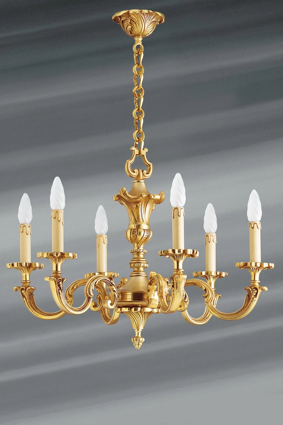 Ce lustre doré à six bougeoirs de style Louis XV est réalisé en bronze massif patiné vieil or. Son dessin d’une grande sobriété et d’un équilibre parfait comprend une partie centrale en deux éléments superposés, ornés de discrets motifs ornementaux moulés et gravés à la main. La partie inférieure (ou culot) est sculptée en forme de trompette striée à larges pétales. Les six branches en double volutes sont décorées de feuilles repliées et soutiennent, dans un très gracieux mouvement, autant de bougeoirs. Les bassins (coupelles situées à la base des bougeoirs) sont assortis au culot de ce lustre. Tout en haut de la chaîne aux épais maillons dorés, se trouve un cache de plafond aux décorations assorties. L’ensemble, d’une délicate élégance, bénéficie de toute la qualité d’exécution des ateliers Lucien Gau: le bronze, massif, est coulé dans un moule perdu en sable, puis travaillé, gravé, fini et patiné à la main. Ne mesurant que 70cm hors chaîne, ce lustre peut être placé sous des plafonds de 2m75 ou plus. Un modèle à cinq lumières au dessin quasiment identique et ne mesurant que 56cm de hauteur est également disponible (référence 12020239). Une applique murale assortie est visible sous la référence 12020240.