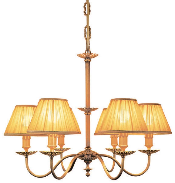 Magnifique lustre à six lumières en bronze vieilli munis de six bras en tiges recourbées ornementées de délicates coupelles ajourées coiffées d’abat-jour plissés en tissu à fins galons. Le lustre est d’une hauteur totale de 52 cm. D’un grand classicisme, ce lustre est la pièce de référence de la collection Adara de la marque italienne de luminaire de luxe italienne Estro. Marque reconnue pour l’excellence de son travail et le choix de ses matériaux. Dans la même collection, à découvrir: une magnifique lampe de chevet sous la référence 13090017, une lampe de table référence 13090018 et un lampadaire référence 13090019.