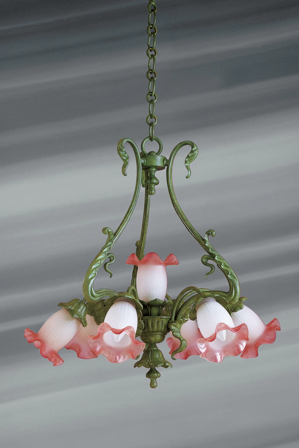 Magique et luxuriante, c’est la collection Art Nouveau, dont est issu ce superbe lustre 7 lumières en bronze peint et pâte de verre colorée. Le modèle est composé comme un panier de fleurs suspendu en bronze peint en vert, avec ses 6 délicates clochettes de pâte de verre aux pétales rosées, chacune, sur une courte tige et dirigées vers le bas, en rayon autour de l’enfilage de petite taille. Celui-ci est surmonté d’une septième fleur dirigée vers le plafond, encadrée par les trois tiges figurant de délicates jeunes pousses, qui triangulent le lustre et se rejoignent autour d’une petite pièce sur laquelle est fixée la chaine métallique. Remarquez la délicatesse du culot qui représente une fleur aux pétales ouvertes donnant naissance à une graine évoquant un pistil. La collection, grâce à la malléabilité du bronze qui permet une grande précision dans les détails, incarne parfaitement l’esthétique romantique à la végétation foisonnante du style Art Nouveau, que vous pouvez trouver par exemple sur certains portiques d’époque du métro parisien.