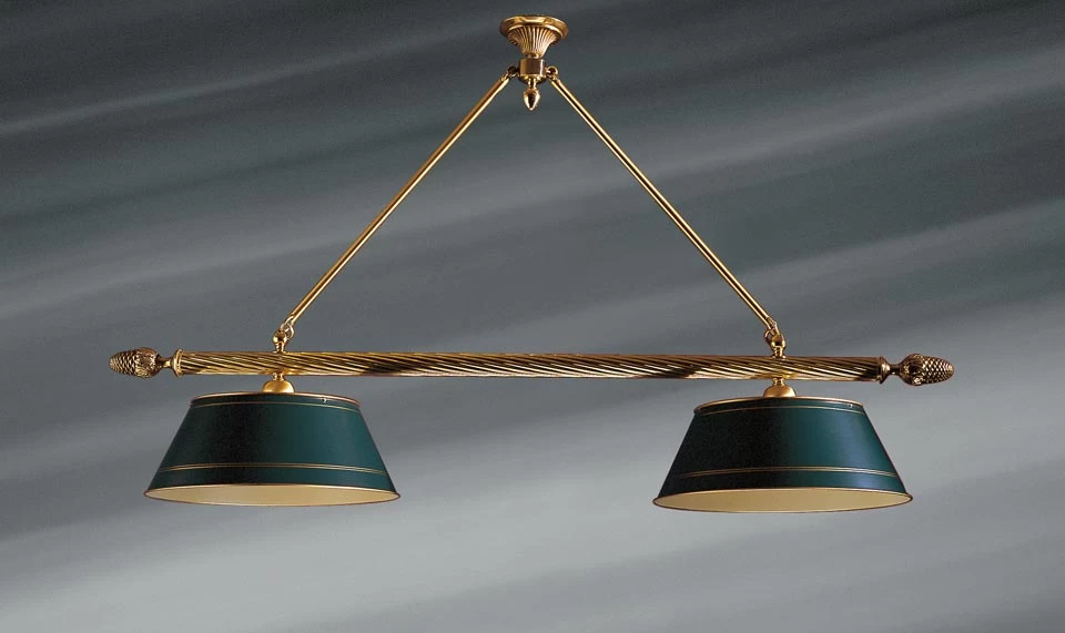 Ce grand lustre en bronze massif de style Directoire, que la longue tige droite rend atypique, sera parfait pour Ă©clairer une table de bibliothèque ou de billard. Ses deux abat-jour verts bronze, dĂ©licatement surlignĂ©s de liserĂ©s vieil or, cachent deux ampoules halogènes Ă vis d’une puissance de 60W assurant un Ă©clairage puissant et harmonieux. Sa tige, aux cannelures torsadĂ©es, est terminĂ©e en ses deux extrĂ©mitĂ©s par des pignes de pin parfaitement mis en valeur par leur finition vieil or. Ce lustre est accrochĂ© au cabochon de fixation cannelĂ© par deux tiges rejoignant le haut de chaque abat-jour, formant un triangle isocèle. La qualitĂ© de ce lustre est assurĂ©e par la Maison Lucien Gau, maĂ®tre d’Ĺ“uvre et fournisseurs des monuments de France, châteaux et ministères.
