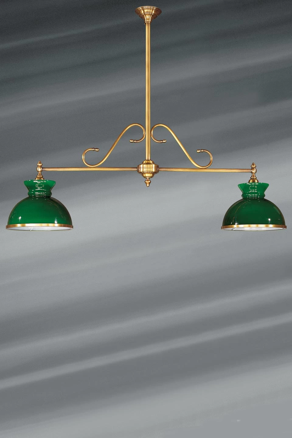 Parfait pour Ă©clairer une table de billard, ce fin et Ă©lĂ©gant lustre Ă barre droite en laiton patinĂ© Ă deux lumières est Ă©quipĂ© de deux verreries vertes, ornĂ©es sur leur bord infĂ©rieur d’une bague assortie. Ce lustre est constituĂ© d’une tige verticale et d’un double bras horizontal, l’ensemble est dĂ©corĂ© de deux ornements dĂ©pouillĂ©s en double volute. Le support de plafond est conique. L’intĂ©rieur de la verrerie est blanc. De style hollandais, ce lustre peut ĂŞtre utilisĂ© pour Ă©clairer une bibliothèque ou une table de billard. Il existe un modèle similaire, Ă tige en volute, visible sous la rĂ©fĂ©rence 12020110.