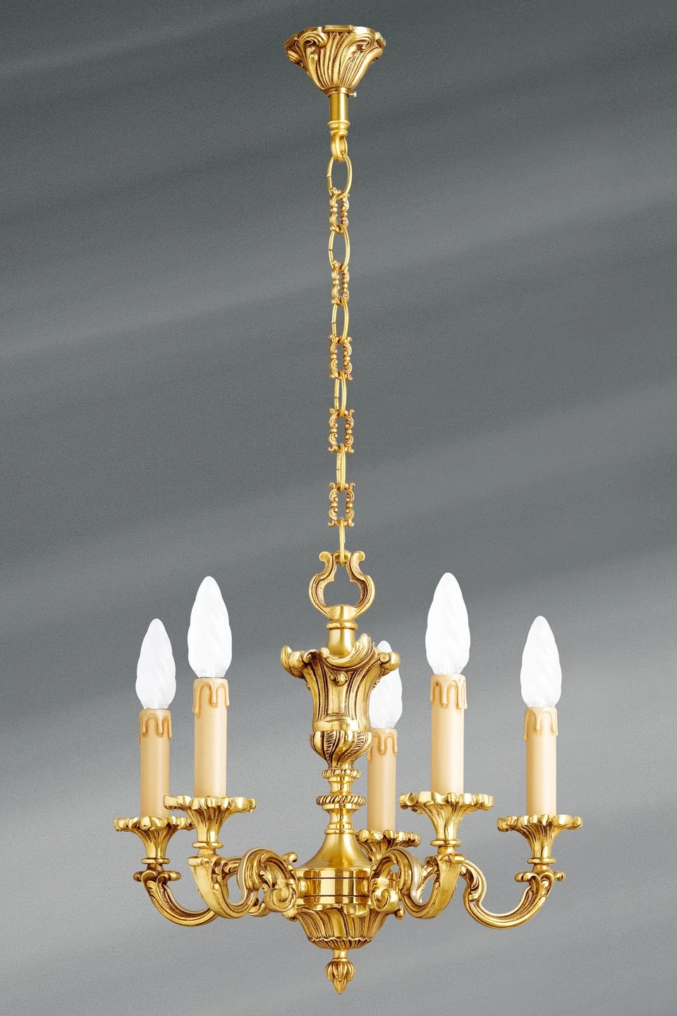 Ne mesurant que 56cm de hauteur, ce lustre doré à cinq bougeoirs de style Louis XV peut être installé sous des plafonds de 2m65 et plus. D’une délicate élégance, il bénéficie de toute la qualité d’exécution des ateliers Lucien Gau: le bronze, massif, est coulé dans un moule perdu en sable, puis travaillé, gravé, fini et patiné vieil or à la main. Son dessin d’une grande sobriété et d’un équilibre parfait comprend une partie centrale en deux éléments superposés, ornés de motifs ornementaux moulés et gravés à la main. La partie inférieure est cannelée. Les cinq branches en double volutes sont décorées de feuilles repliées et soutiennent, dans un très gracieux mouvement, autant de bougeoirs. Les bassins (coupelles à la base de chaque bougeoir) sont striés. Tout en haut de la chaîne aux épais maillons dorés, se trouve un cache de plafond aux décorations assorties. Un modèle à six lumières au dessin quasiment identique est également disponible sous la référence 12020233.