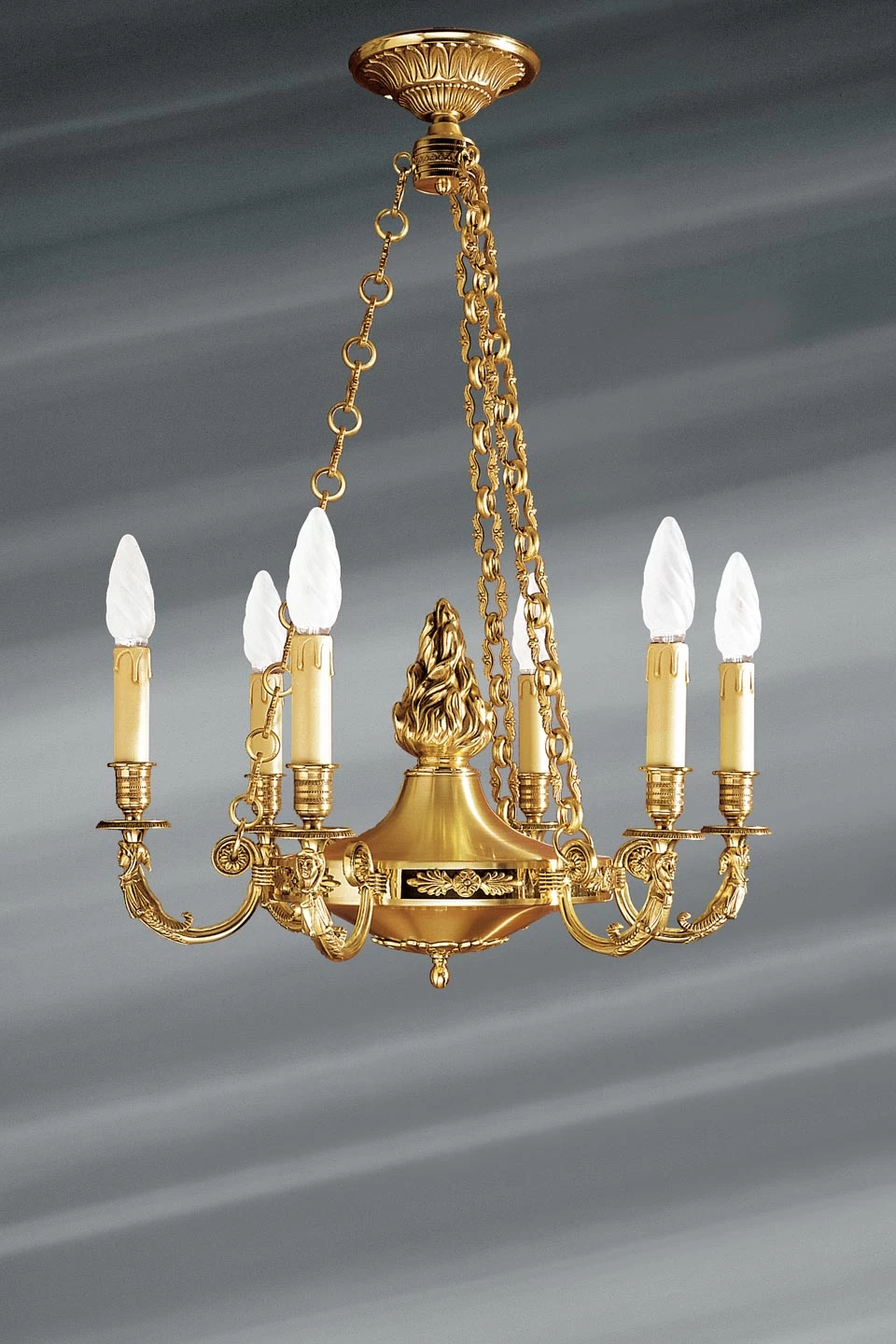Force et puissance se dégagent de ce lustre doré de style Directoire, en bronze massif, décoré de symboles révolutionnaires comme la flamme, élément central, et le bonnet phrygien qui incarnent la Liberté. Son corps central portant les six lumières est en forme de bruloir d’où s’échappe la belle flamme or vif. Il est suspendu par un trio de chaînes aux maillons toriques. Les bras portant lumières se terminent par des bustes de femmes portant le bonnet phrygien, élément à valeur hautement symbolique. Le moulage au sable de ce lustre et la qualité des alliages ayant donné son bronze, ont permis aux artisans d’art qui l’ont assemblé, sculpté et terminé de façon entièrement manuelle d’en faire une véritable œuvre d’art.