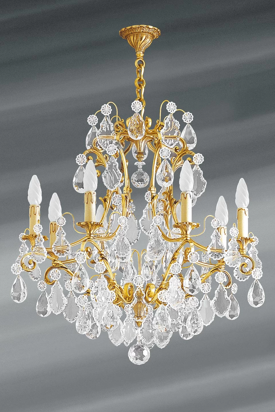 De style Louis XV, ce magnifique lustre doré en cristal de bohème conjugue une très fine structure métallique à une très belle profusion de pampilles de plusieurs formes. La structure de ce lustre prend la forme d’un entrelac de très raffinées branches aux nombreuses volutes et aux délicats ornements. Ces branches s’appuient sur la partie inférieure constituée d’un culot cannelé et aboutissent au sommet de ce luminaire. Les bassins (coupelles situées à la base des bougeoirs) sont sculptés en forme de pétale, les bougeoirs s’y enchâssent directement. Ce lustre est décoré de très nombreuses pampilles en cristal de bohème, taillées en feuilles, en poire, en boule et en rosaces, mises en valeur par la finesse de la structure métallique. L’ensemble bénéficie d’un éclatant équilibre de formes, et d’une fabrication exemplaire, effectuée dans les ateliers français du fabricant en ne recourant qu’aux plus traditionnelles méthodes artisanales. Avec une hauteur de 100cm avec chaîne, ce lustre peut être intégré à de nombreux intérieurs, en pose classique (extrémité inférieure à 200cm du sol) ou en pose abaissée, plus contemporaine, par exemple au-dessus d’une table de salle à manger (extrémité inférieure à 160cm du sol). Il existe une version à six lumières de ce lustre, visible sous la référence 12020192.