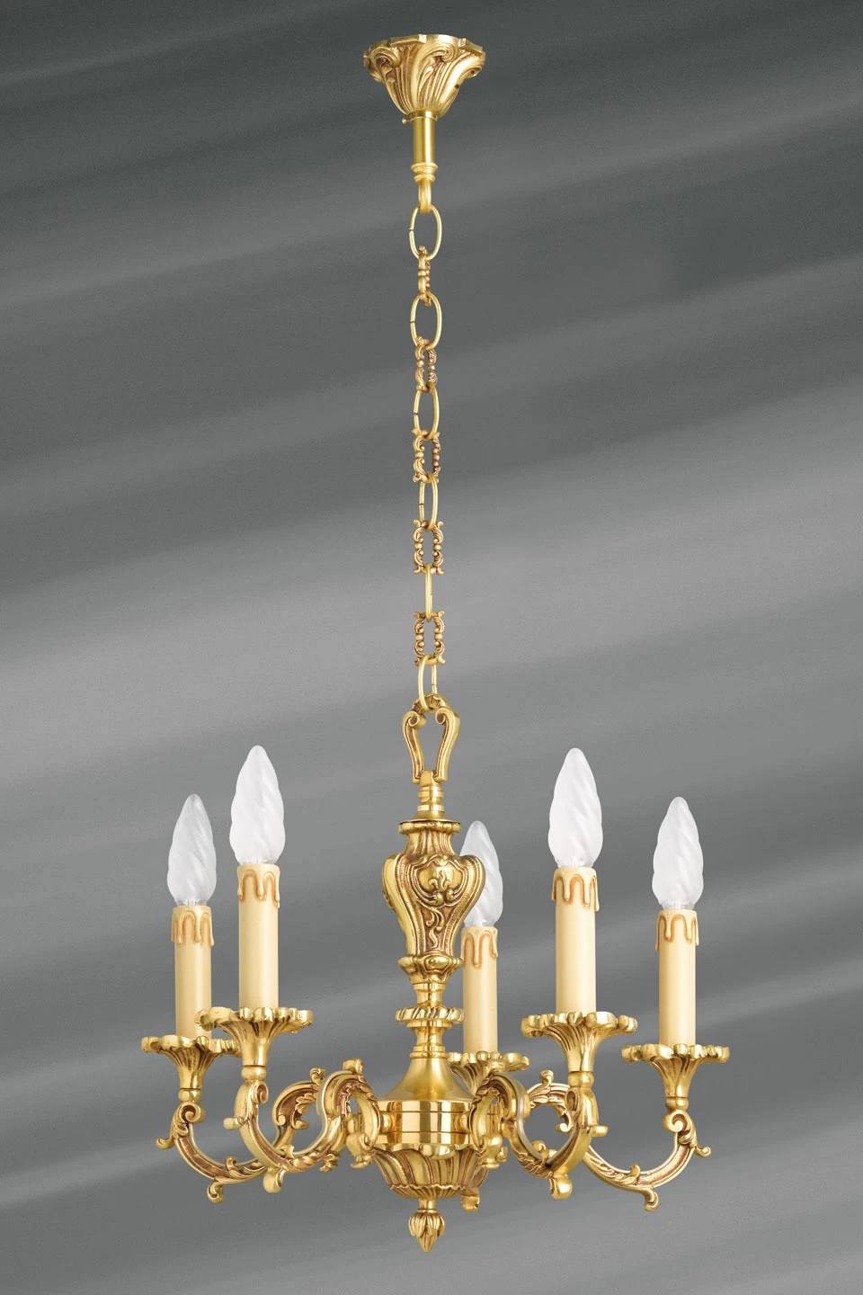 Muni de cinq lumières, ce lustre doré Louis XV aux formes resserrées comprend une partie centrale en forme de vase, dont les courbes sont très élégamment soulignées de divers motifs ornementaux concentriques. Les cinq bras recourbés sont décorés de façon assortie, et se terminent en petite volute. Chaque bougeoir est muni, à sa base, d’un bassin en forme de chanterelle et orné de stries. Ce lustre n’est pas équipé de bobèches. Fabriqué en bronze massif, il est fabriqué à la main dans les ateliers français de Lucien Gau. Sur le bronze est appliquée une patine vieil or. Ce lustre ne mesure que 55cm de hauteur hors chaîne, et peut donc être fixé sous des hauteurs de plafond à partir de 2m60. Un modèle à six lumières au dessin quasiment identique est également disponible sous la référence 12020251, deux autres modèles à la partie centrale plus arrondie sont aussi sous les référence 12020284 (six lumières) et 12020243 (cinq lumières).