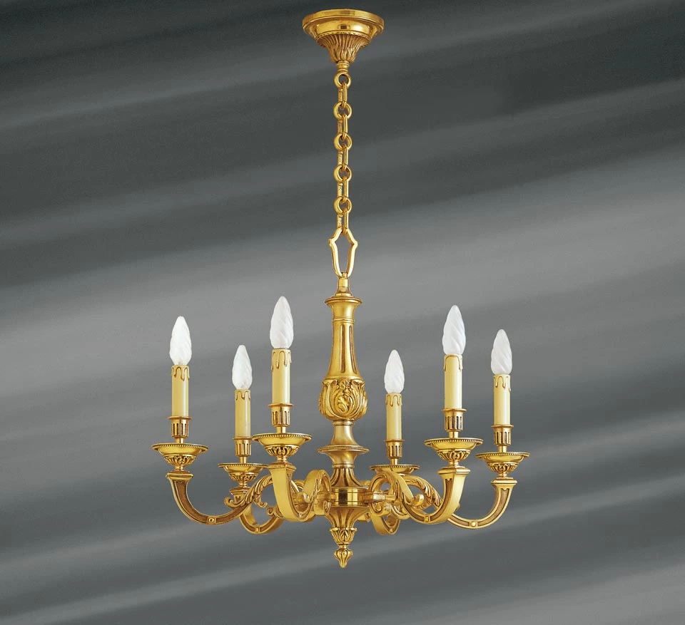Ce superbe lustre de style Louis XVI, magnifiquement travaillé, réalisé en bronze massif est doté de six bras en double volutes sur clavette portant lumières. Sa patine vieil or met en valeur ses éléments de décoration comme le travail délicat de ses bassins au motif perlé. Remarquer le fantastique travail de relief réalisé sur les profils de chacun de ses bras ou encore sur les cannelures de ses bobèches et des éléments verticaux du corps central. La précision inouïe et la qualité extrême de ce travail exceptionnel a été rendu possible grâce au savoir-faire sans pareil des artisans qui l’ont profilé dans les ateliers de la maison Lucien Gau fournisseur historique des monuments français. Ce lustre est également disponible en cinq lumières, il est visible sous la référence 10060039.